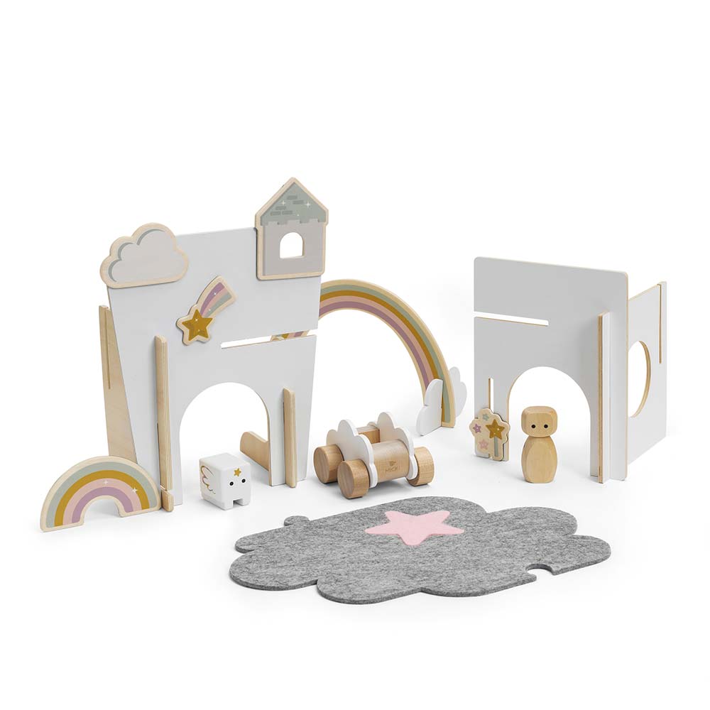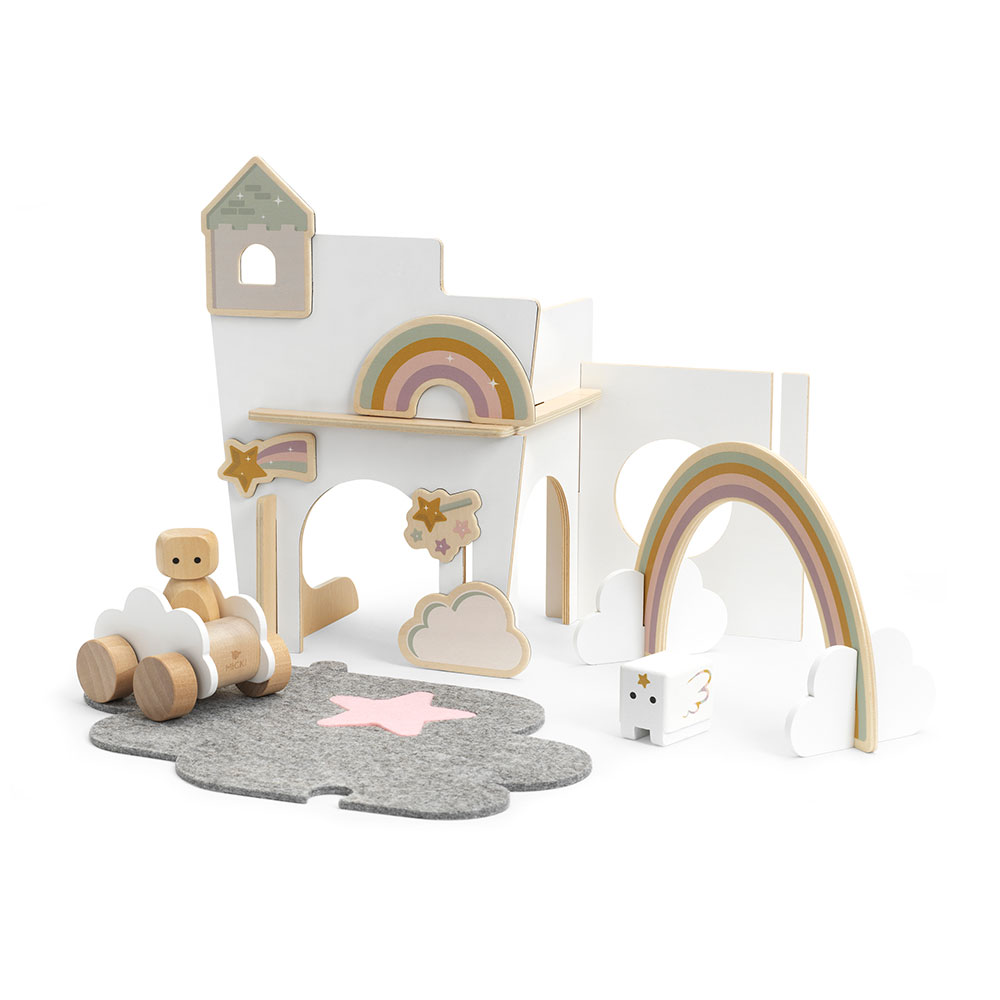 Ten słodki zestaw szwedzkiej marki Micki zachwyca od pierwszego wejrzenia! Tęczowy Domek zawiera: 5 ścian, ludzika, jednorożca, tęczę z chmurkami, samochód z chmurkami, 5 elementów z magnesami (tęcza, spadająca gwiazda, magiczna różdżka, wieżyczka i chmurka) oraz dwuczęściowa mata do zabawy z filcu w kształcie chmurki. Czy rycerz na białym jednorożcu uratuje królewnę z wieży? A może zabierze ją na przejażdżkę swoim niezwykłym pojazdem? Scenariuszy bajkowej zabawy jest tak wiele!