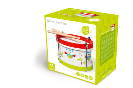 Bęben z pałeczkami to idealny instrument dla przyszłych małych perkusistów. Bęben posiada specjalny pasek umożliwiający zawieszenie instrumentu na szyi oraz dwie drewniane pałeczki pałeczki.