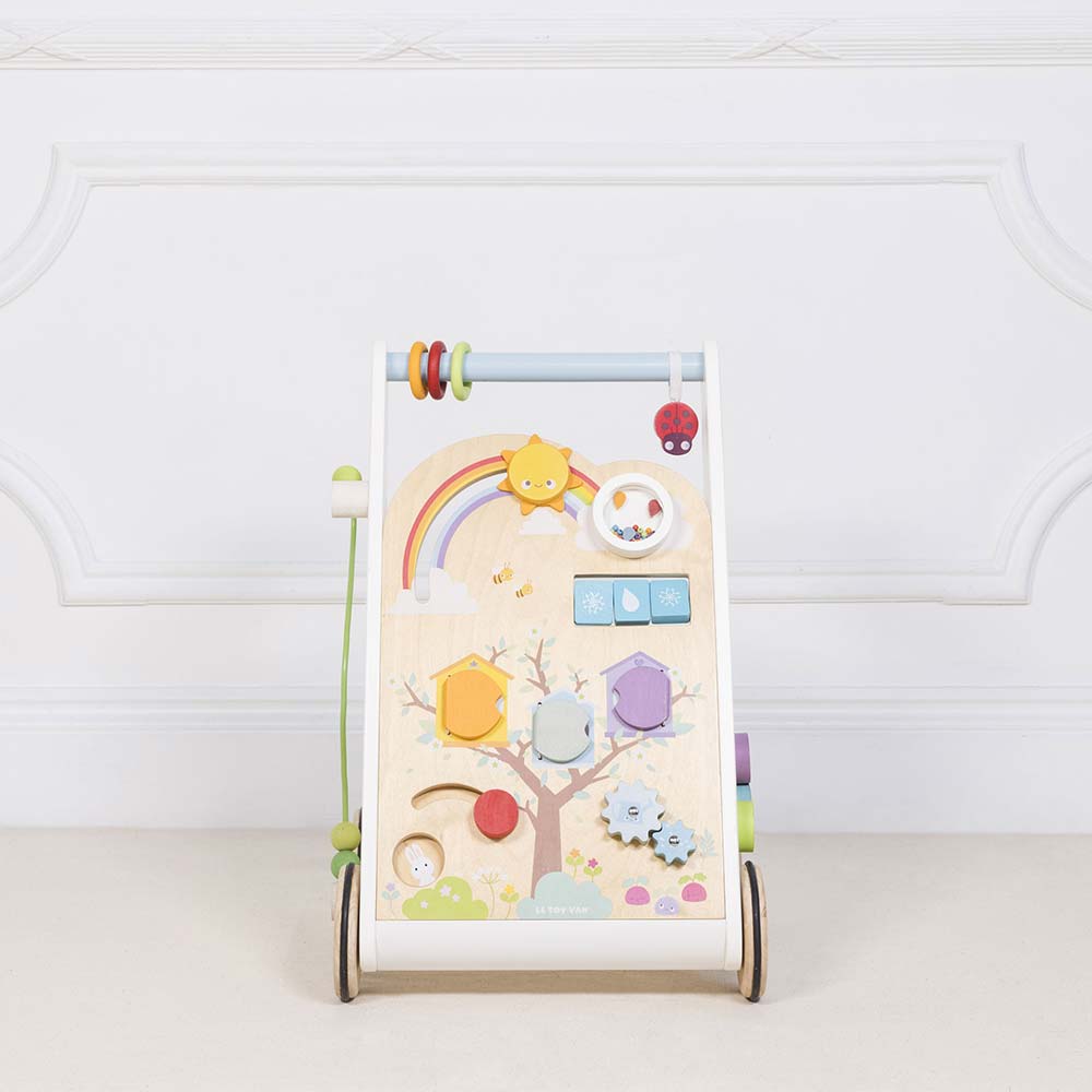 Ten klasyczny chodzik w zabawny sposób stymuluje umiejętności psychomotoryczne, rozwijanie koordynacji wzrokowo-ruchowej i wyobraźni. Wykonany ze zrównoważonych materiałów, z bezpiecznymi dla dzieci krawędziami stanowi idealny pomysł na przemyślany prezent dla wyjątkowego maluszka, który zaczyna stawiać pierwsze kroki. Elementy do odkrywania i zabawy sprawiają, że pchacz jest niczym centrum sensoryczne, które wspiera ciekawość i zachęca do wczesnej nauki poprzez zabawę.