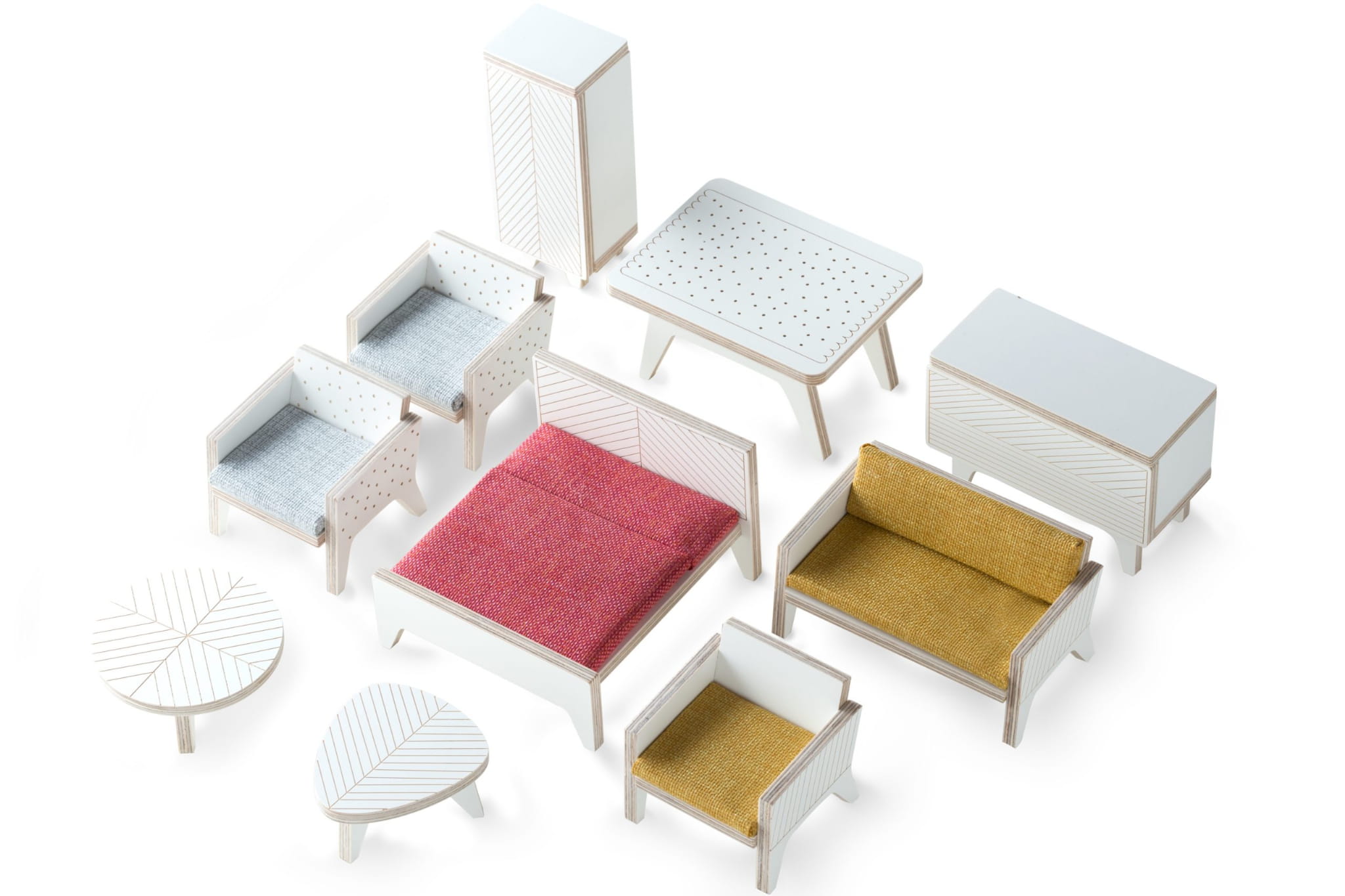 Mebelki do domku zaprojektowano w nowoczesnym stylu oraz dodano tapicerkę. Każdy element jest kilkukrotnie szlifowany (ręcznie), mebelki są składane z najwyższą starannością