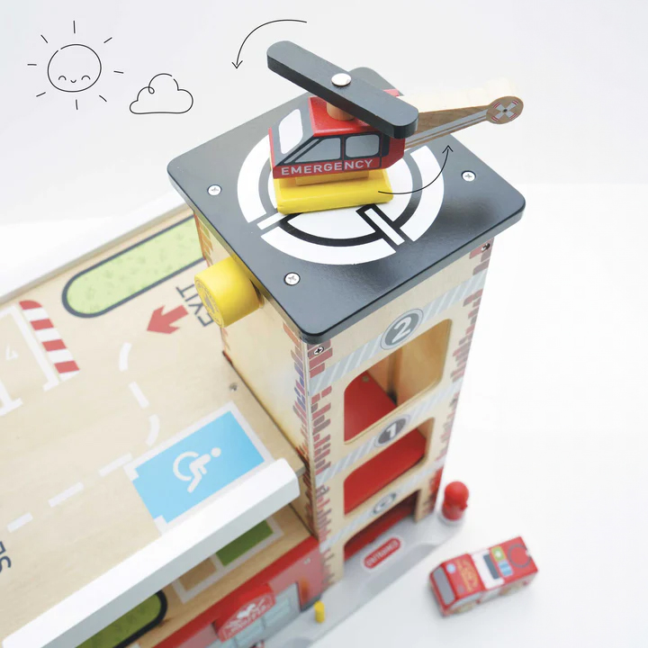 Drewniany garaż wielopoziomowy służby ratunkowe, zabawka, dzieci Le Toy Van