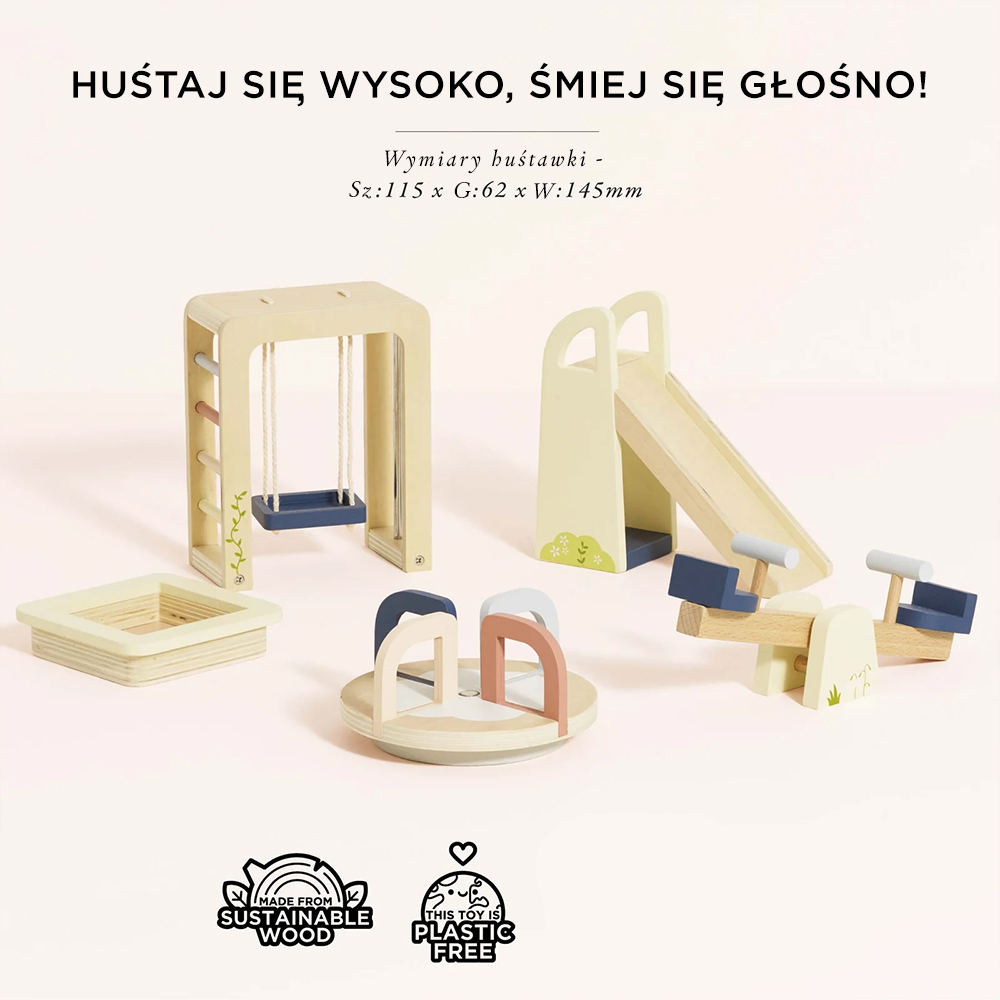 Lalki uwielbiają czas spędzony aktywnie na placu zabaw! Plac zabaw stanowi urocze uzupełnienie każdej kolekcji zabawek dla dzieci, idealnie pasuje do wszystkich domków i lalek marki Le Toy Van sprzedawanych oddzielnie.