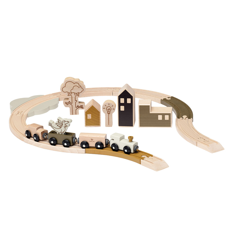 Zestaw oferuje nieograniczone możliwości zabawy oraz kreatywnego tworzenia różnych aranżacji. Ta zabawka marki Micki z serii Premium prowadzi Twojego dziecko w twórczą podróż przez kolejne etapy jego rozwoju. Różne kształty elementów rozwijają wyobraźnię dziecka i jego zdolność do koordynacji ruchowej. Tory mają kształt puzzli, dzięki czemu Twoje dziecko może łatwo organizować i zmieniać trasę, a taka zabawa jest ekscytująca i nigdy się nie nudzi. Drewniane zabudowania i elementy infrastruktury pozwalają eksperymentować do woli. Szwedzki design i neutralne kolory klocków sprawiają, że zaprojektowana przez Twoje dziecko stacja kolejowa jest również wyszukanym elementem dekoracyjnym dziecięcego pokoju.