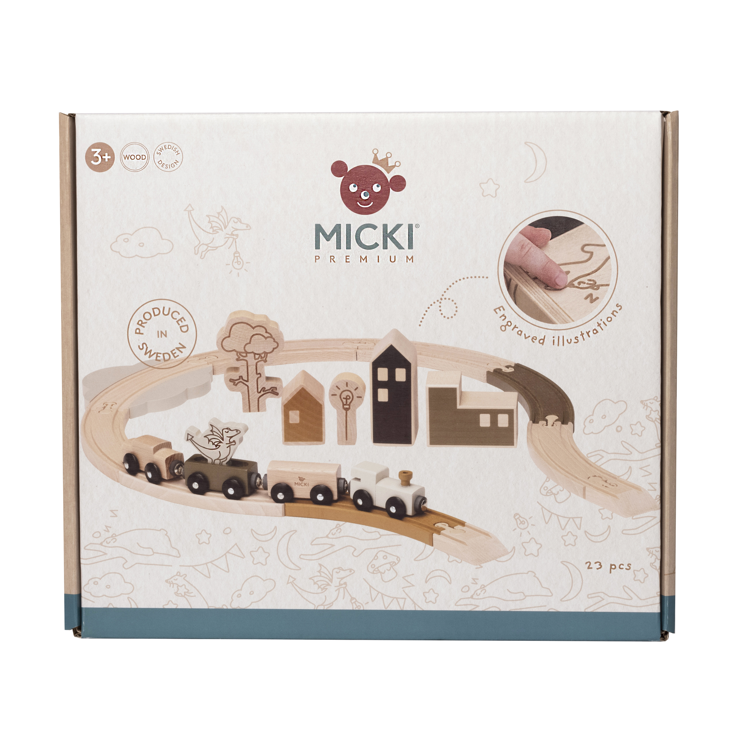 Seria Micki Premium:Wyjątkowa seria Premium marki Micki wykorzystuje różne rodzaje drewna, co sprawia, że każdy element jest wyjątkowy. Ilustracje inspirują dzieci do ciekawego opowiadania historii i angażowania wszystkich zmysłów podczas zabawy.