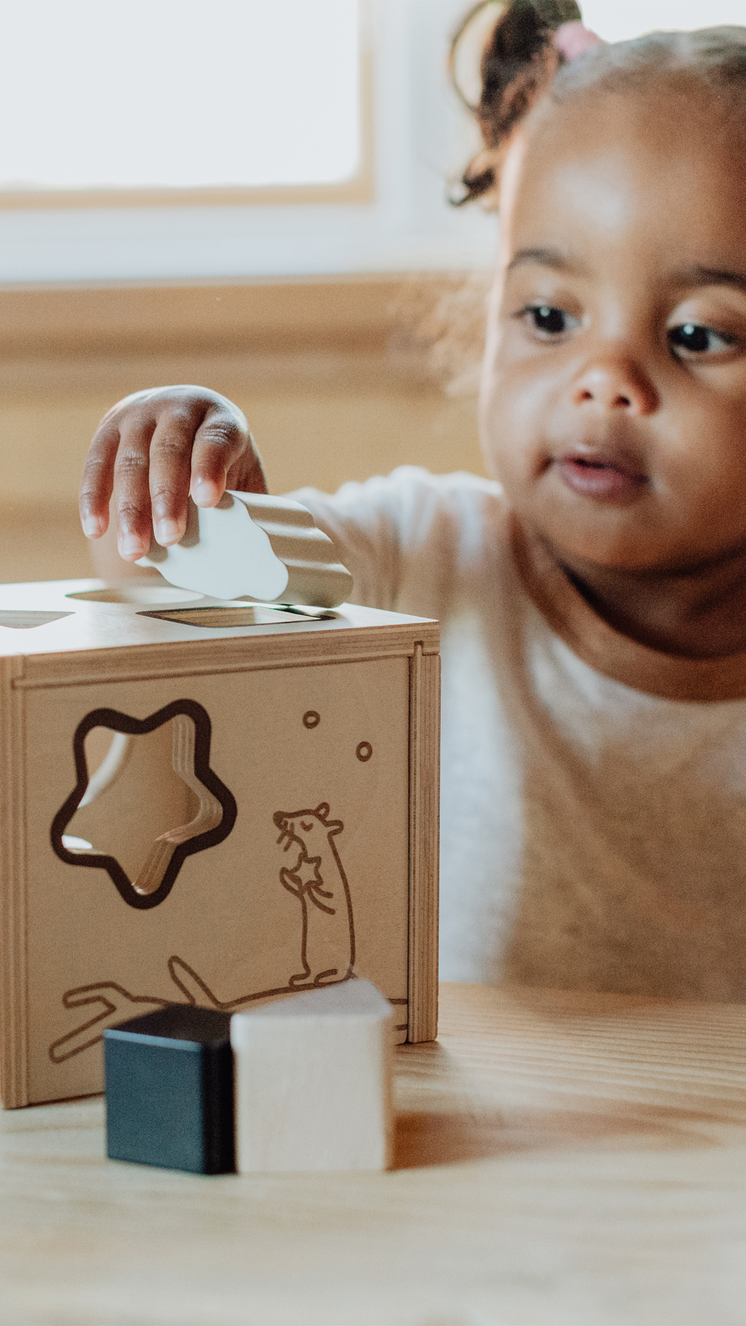 Dno pudełka jest pokryte filcem, dzięki czemu każdy wrzucony klocek wydaje przyjemny dla małych uszu dźwięk, co wzbogaca sensoryczne doświadczenie z interakcji z sorterem. Sorter kształtów zawiera 6 drewnianych klocków w pastelowych kolorach w kształcie chmurki, księżyca, gwiazdki, koła, trójkąta i kwadratu. Pudełko jest ozdobione grawerowanymi fantazyjnymi ilustracjami, które maluch może zobaczyć, ale także poczuć angażując zmysł dotyku, dzięki czemu czerpie jeszcze więcej przyjemności z zabawy.