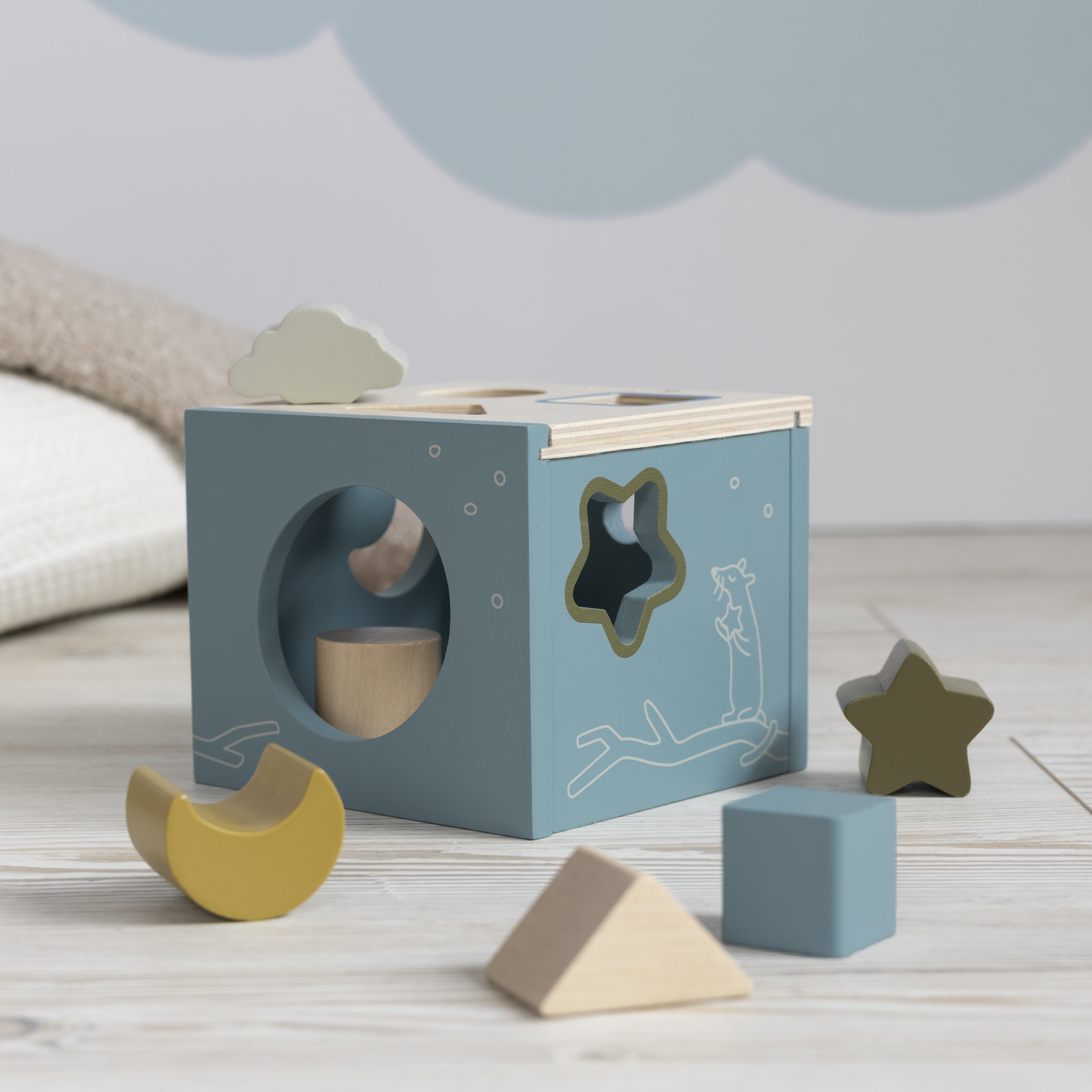 Dopasuj kształt klocka do kształtu na ściance sortera, aby wrzucić go do środka! Klasyczna drewniana zabawka szwedzkiej marki Micki - niebieski sorter kształtów bawi, rozwija i uczy Twoje dziecko. Otwory sortera są idealnie dopasowane do kształtu uroczych drewnianych klocków, więc dziecko ma dużą frajdę z wrzucania ich do środka. Gdy klocki są już w pudełku, wystarczy wyjąć je przez otwór w tylnej ściance i zacząć zabawę od nowa.Dno pudełka jest pokryte filcem, dzięki czemu każdy wrzucony klocek wydaje przyjemny dla małych uszu dźwięk, co wzbogaca sensoryczne doświadczenie z interakcji z sorterem. Sorter kształtów zawiera 6 drewnianych klocków w pastelowych kolorach w kształcie chmurki, księżyca, gwiazdki, koła, trójkąta i kwadratu. Pudełko jest ozdobione fantazyjnymi ilustracjami, które pozytywnie wpływają na wyobraźnię malucha i zapewniają jeszcze więcej przyjemności z zabawy.