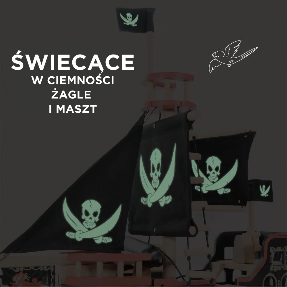 Ten klasyczny, nagradzany drewniany statek pomalowanego na intensywny czarny kolor, z falującymi żaglami i pirackimi flagami z tradycyjnym motywem czaszki i skrzyżowanych mieczy jest bardzo realistyczny.