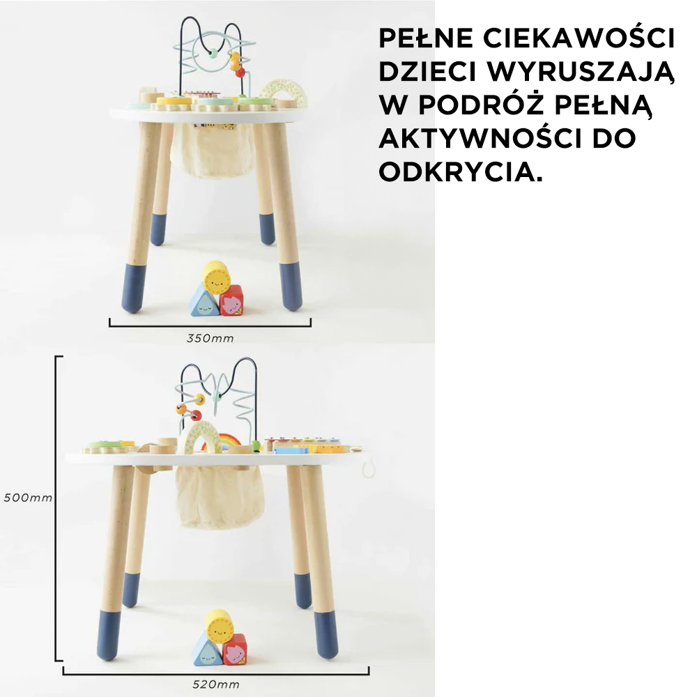Ten solidny stolik powstał po to, aby przez lata uczyć i cieszyć najmłodszych. To centrum aktywności zostało wykonane z drewna pozyskanego ze zrównoważonych źródeł, a nietoksyczne i bezpieczne dla dzieci farby wodne przepełniają stolik żywymi kolorami, które angażują malucha do radosnej zabawy.