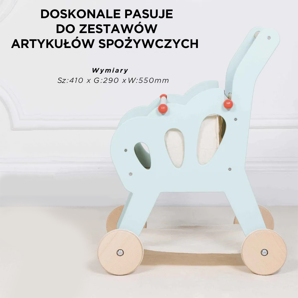 Zaprojektowany w Wielkiej Brytanii wózek jest wykonany z drewna pochodzącego ze zrównoważonych zasobów. Starannie wykonana i pomalowana farbami bezpiecznymi dla dzieci na pastelowy błękitny kolor sprawia, że wszystkie jej elementy realistycznie odzwierciedlają prawdziwy i zarazem bardzo luksusowy wózek na zakupy.