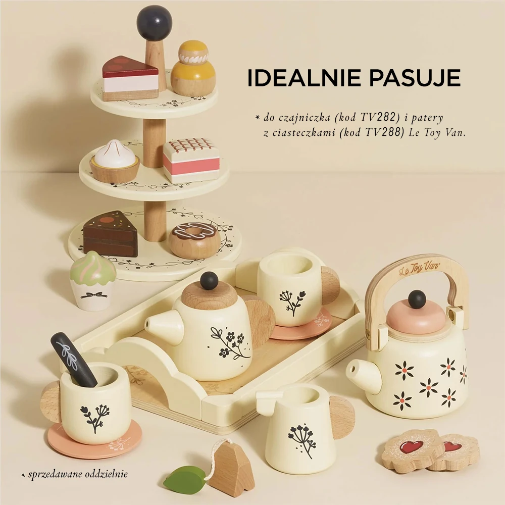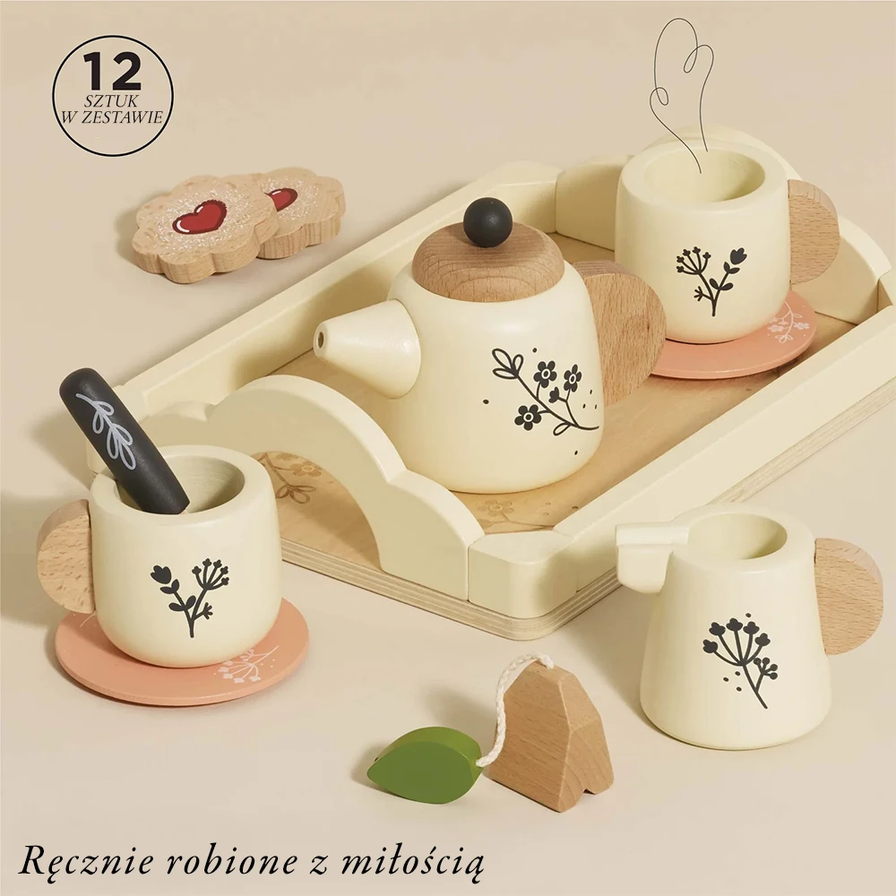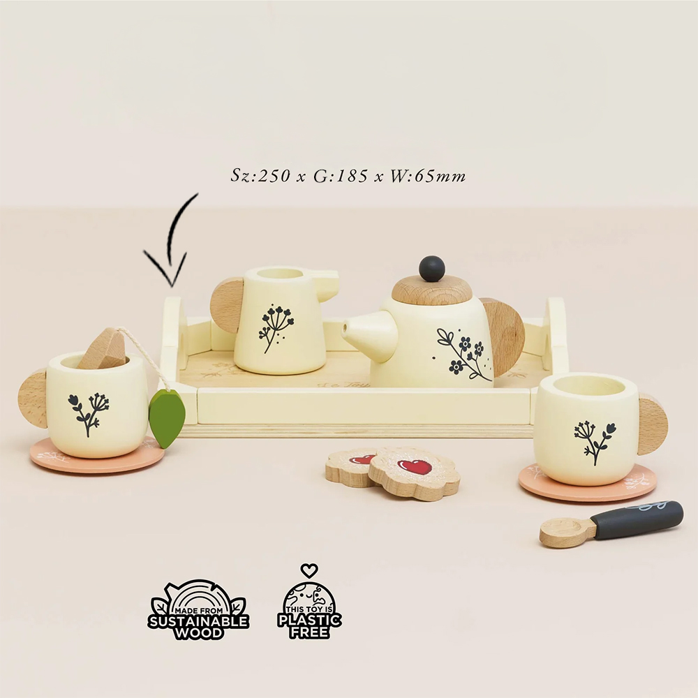Zestaw ma tonację złamanej bieli, naturalnego drewna z czarnymi akcentami, udekorowany uroczymi motywami roślinnymi. Ten 12-elementowy zestaw zawiera wszystko, czego potrzebuje Twoje dziecko, aby zorganizować własne spotkanie przy herbacie. Znajdują się w nim pięknie wykonane filiżanki i spodki, uroczy imbryk, torebka herbaty, dzbanuszek na mleko, a nawet ciasteczka z dżemem i cukrową posypką, które tworzą niezapomniane wrażenia podczas picia herbaty. Taca do serwowania umożliwia maluchom łatwe podawanie herbaty.