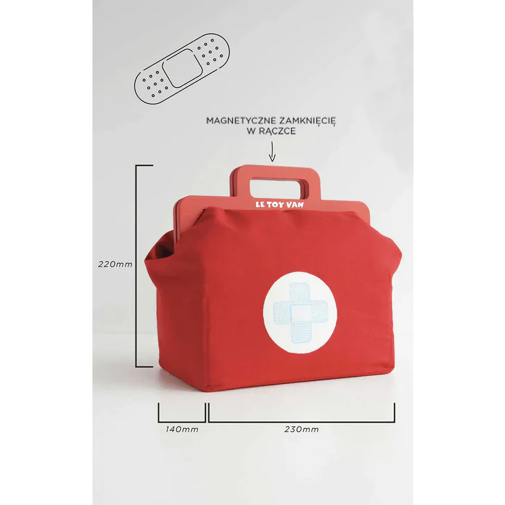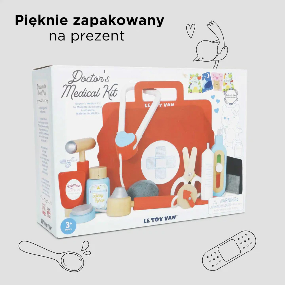 Zestaw lekarski - idealny dla aspirujących młodych lekarzy i pielęgniarek, promuje interakcję społeczną poprzez kreatywną zabawę, rozwija umiejętności motoryczne i zręczność. Składa się z torby w stylu vintage wykonanej z czerwonej tkaniny z uchwytami do przenoszenia, zamykanej na magnes z solidnym drewnianym dnem.