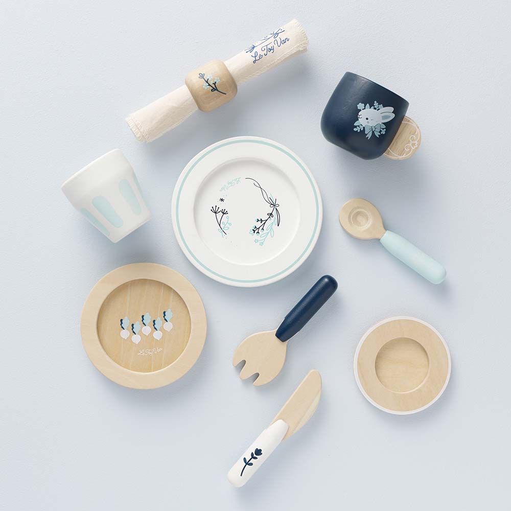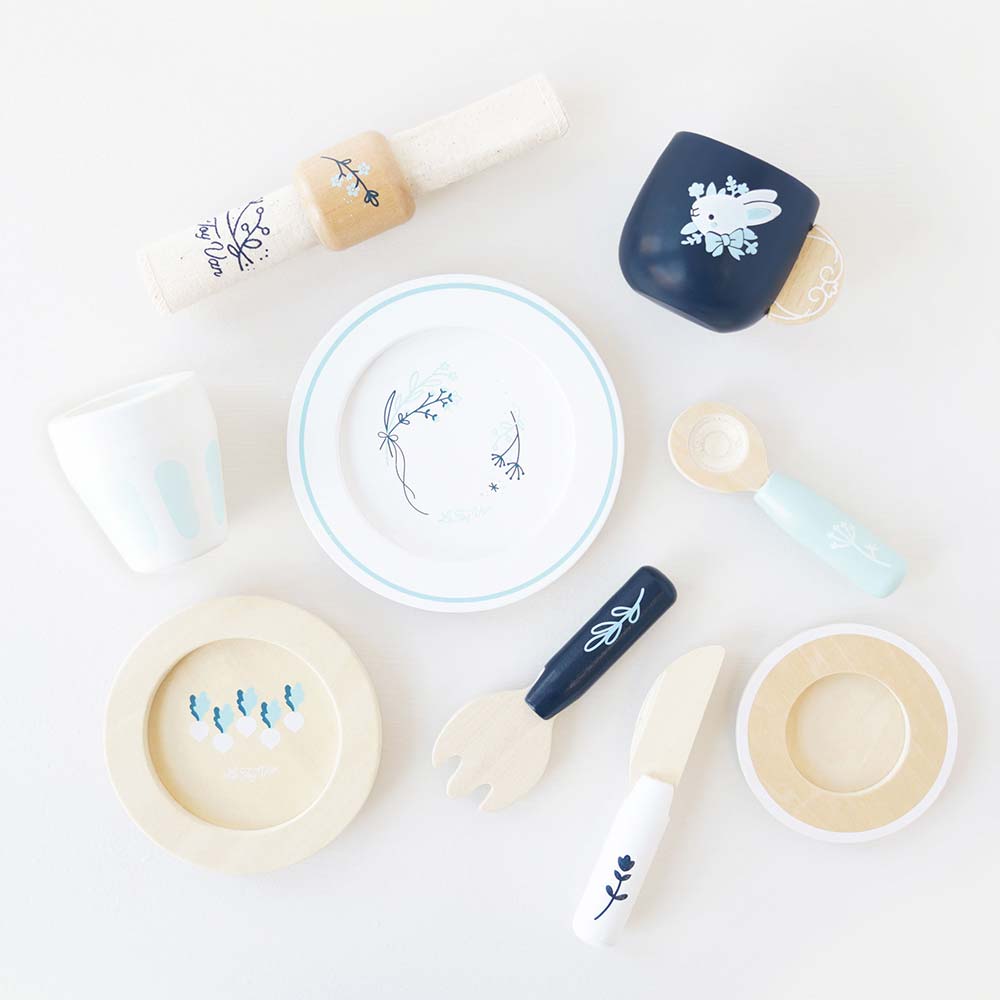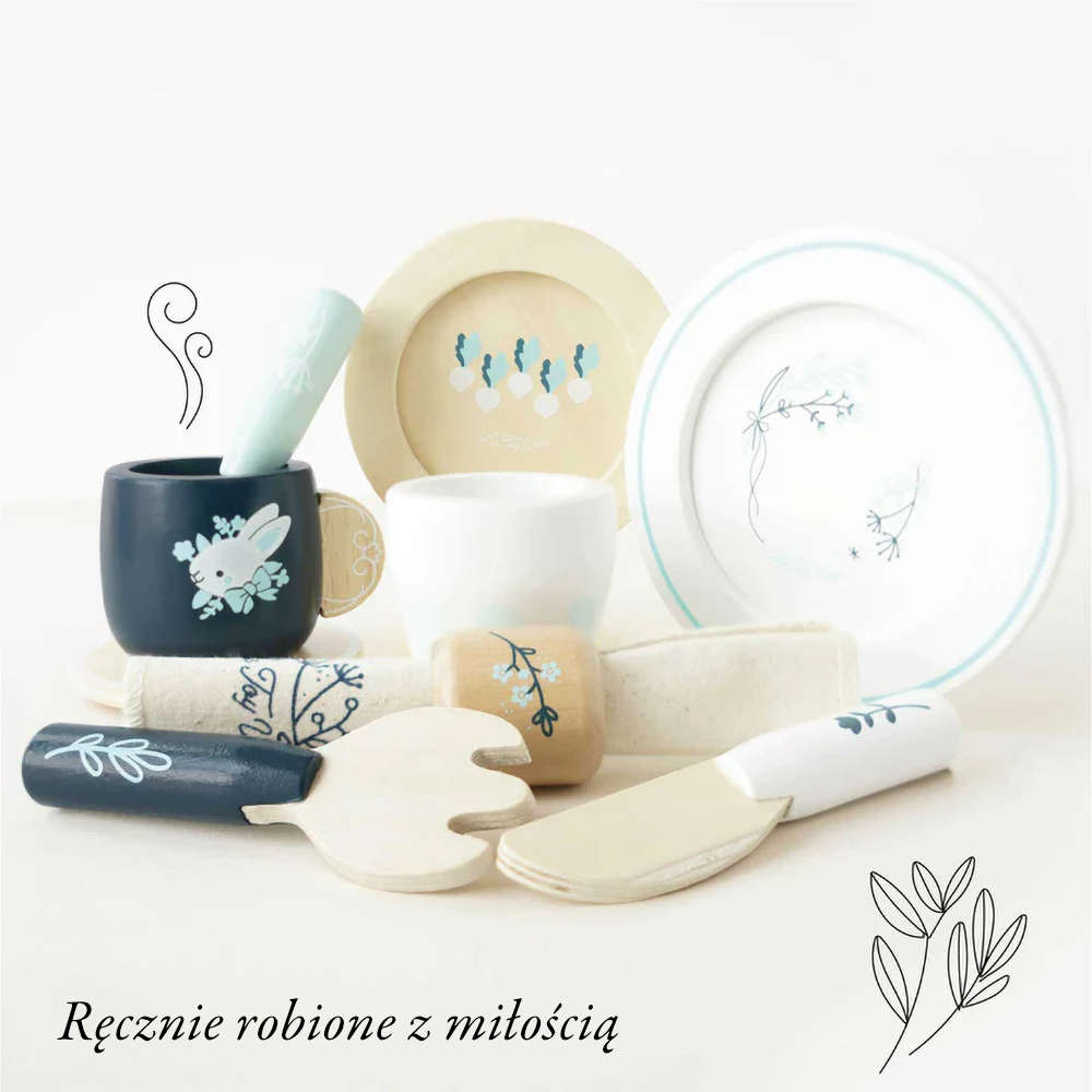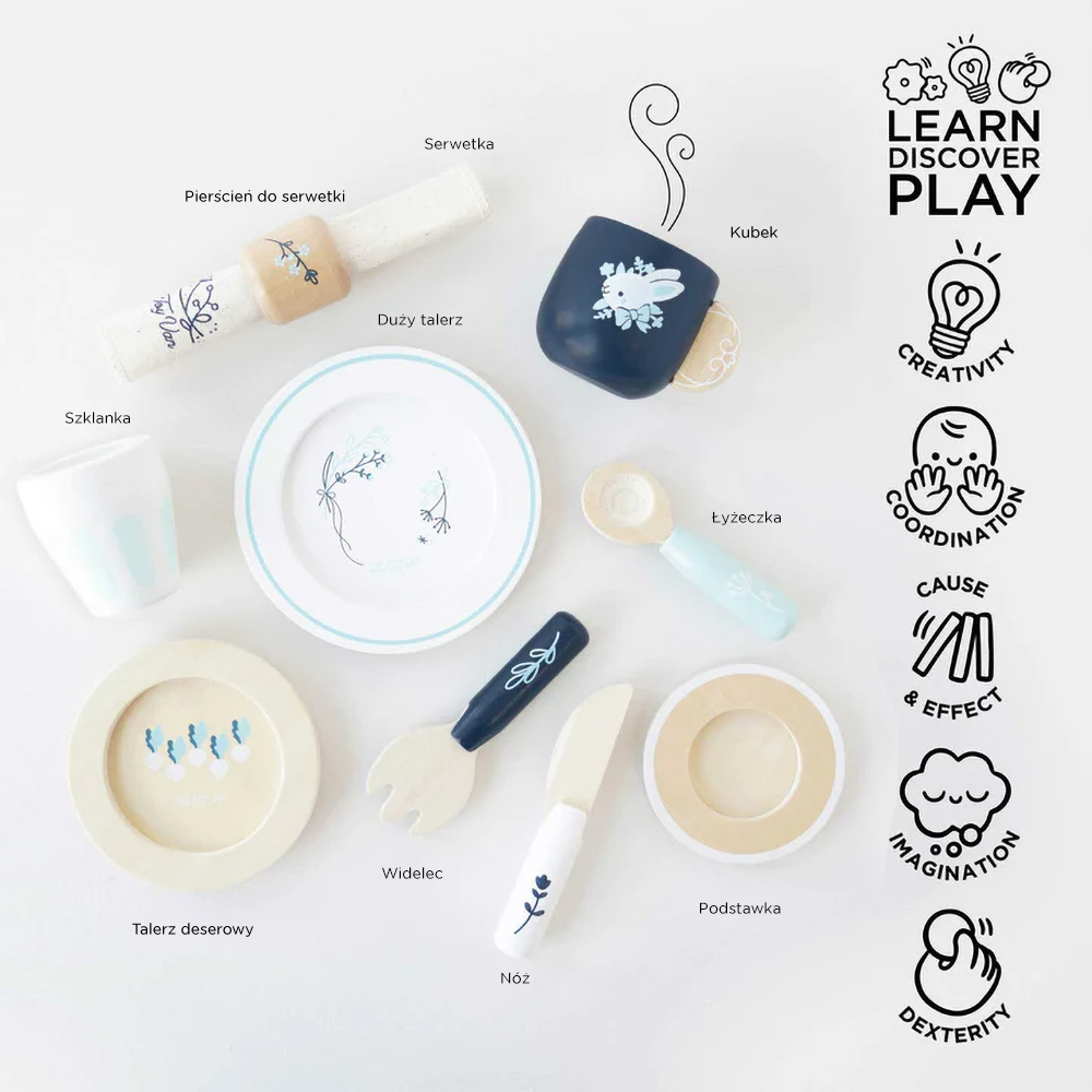 Oryginalny zestaw obiadowy składa się z bawełnianej serwetki z drewnianym pierścieniem, kubka, podstawki, filiżanki, 2 talerzy, noża, widelca i łyżki. Ta bardzo elegancka zastawa jest w kolorach błękitu, bieli i naturalnego drewna ozdobiona grafiką o tematyce botanicznej, unikalną dla każdego przedmiotu. Zabawka została wykonana z drewna i nie zawiera plastiku. Atrakcyjny design i staranne wykonanie z dbałością o detale zapraszają Twoje dziecko do wybornej, kreatywnej zabawy, odgrywania ról i tworzenia zupełnie nowych historii.