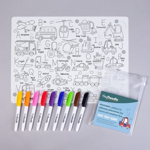 Mata Silikonowa A3 do Wielokrotnego Kolorowania Hey Doodle - Pojazdy to kolorowanie bez końca.