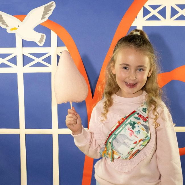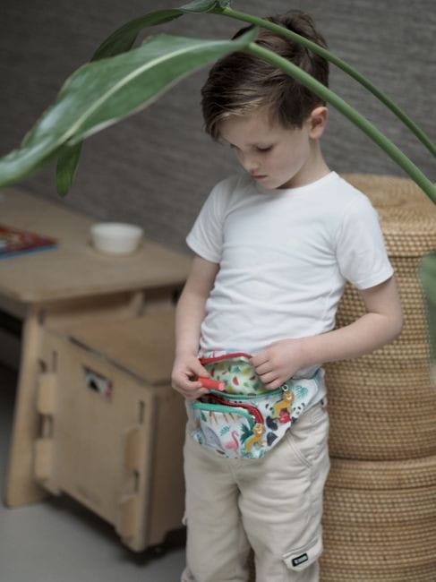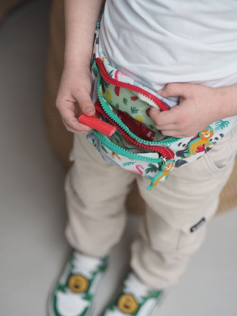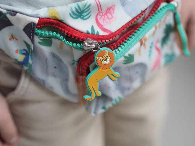 Stylowa saszetka z paskiem ozdobiona motywem dżungli. Saszetka posiada pojemną komorę główną i przednią kieszeń, obie zamykane na wygodne suwaki z breloczkami w kształcie uroczych lwów. Regulowany pasek umożliwia noszenie jej na biodrach lub na ramieniu. Wewnątrz znajduje się plakietka na dane dziecka lub rodziców. Idealna na wycieczki i codzienne przygody, zapewniając wygodę i bezpieczeństwo przechowywania drobiazgów.
