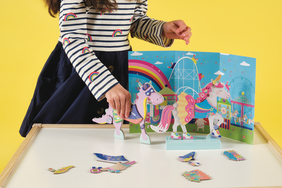 Magnetyczna układanka kreatywna Fantastyczne Zwierzaki marki Floss & Rock to niesamowita przygoda i gwarancja świetnej zabawy! Zestaw zawiera figurki jednorożca i smoka, 6 wymiennych strojów dla obu zwierząt oraz liczne akcesoria, co daje nieskończone możliwości ubioru. Ubierz smoka i jednorożca, a następnie wybierz się na przejażdżkę na karuzeli lub odwróć scenę i wybierz się na spacer po lesie, aby zobaczyć zamek. Zestaw jest idealny do zabawy w pojedynkę lub z przyjaciółmi, a dzięki kompaktowym rozmiarom świetnie sprawdzi się również w podróży.
