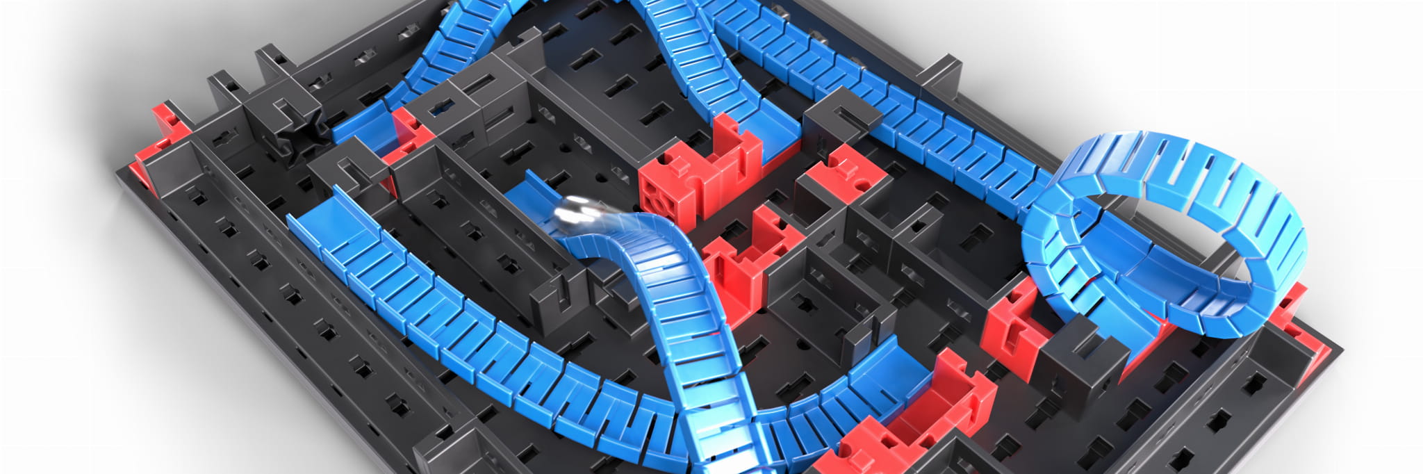 Wykorzystując elementy tego zestawu możesz zbudować grę labirynt. Ćwicz zręczność i wytrzymałość sam lub z przyjaciółmi.