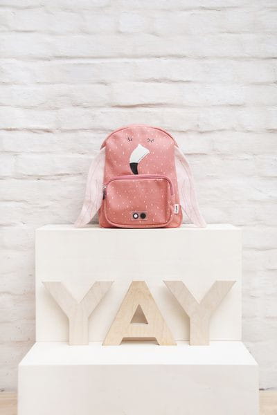 Ma małą kieszonkę z przodu i dużą komorę z małą przegródką w środku i miejscem do zapisania np. imienia dziecka, numeru telefonu.