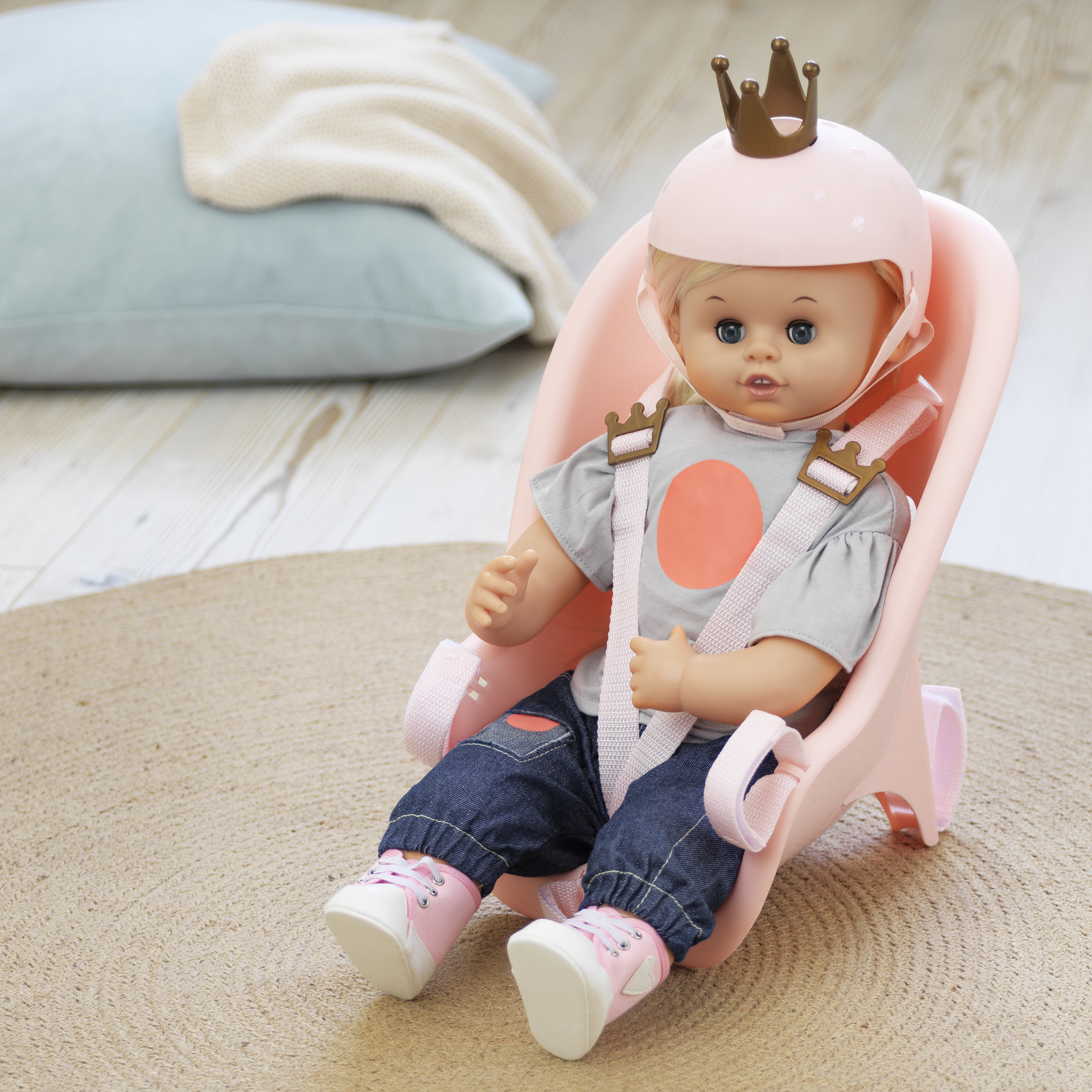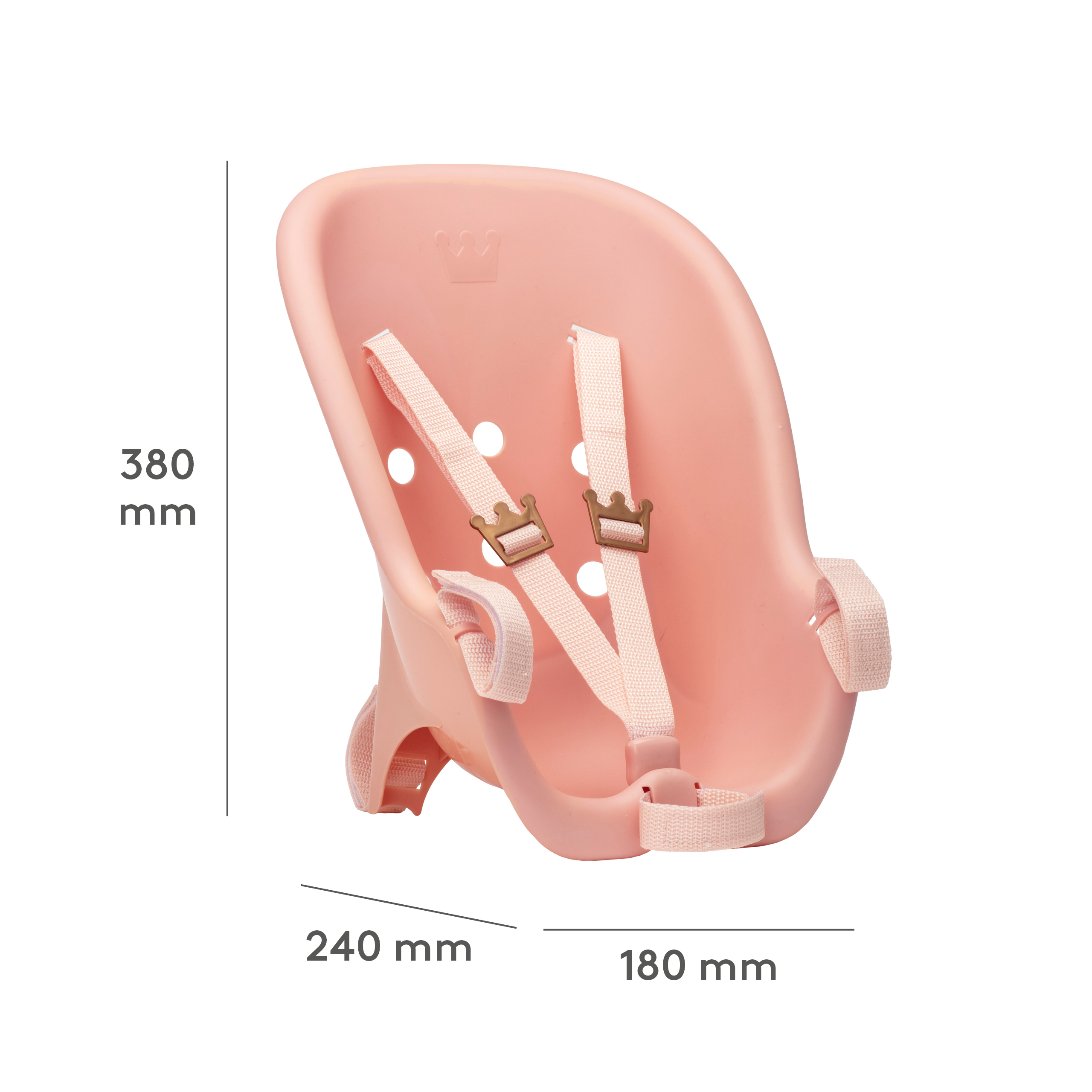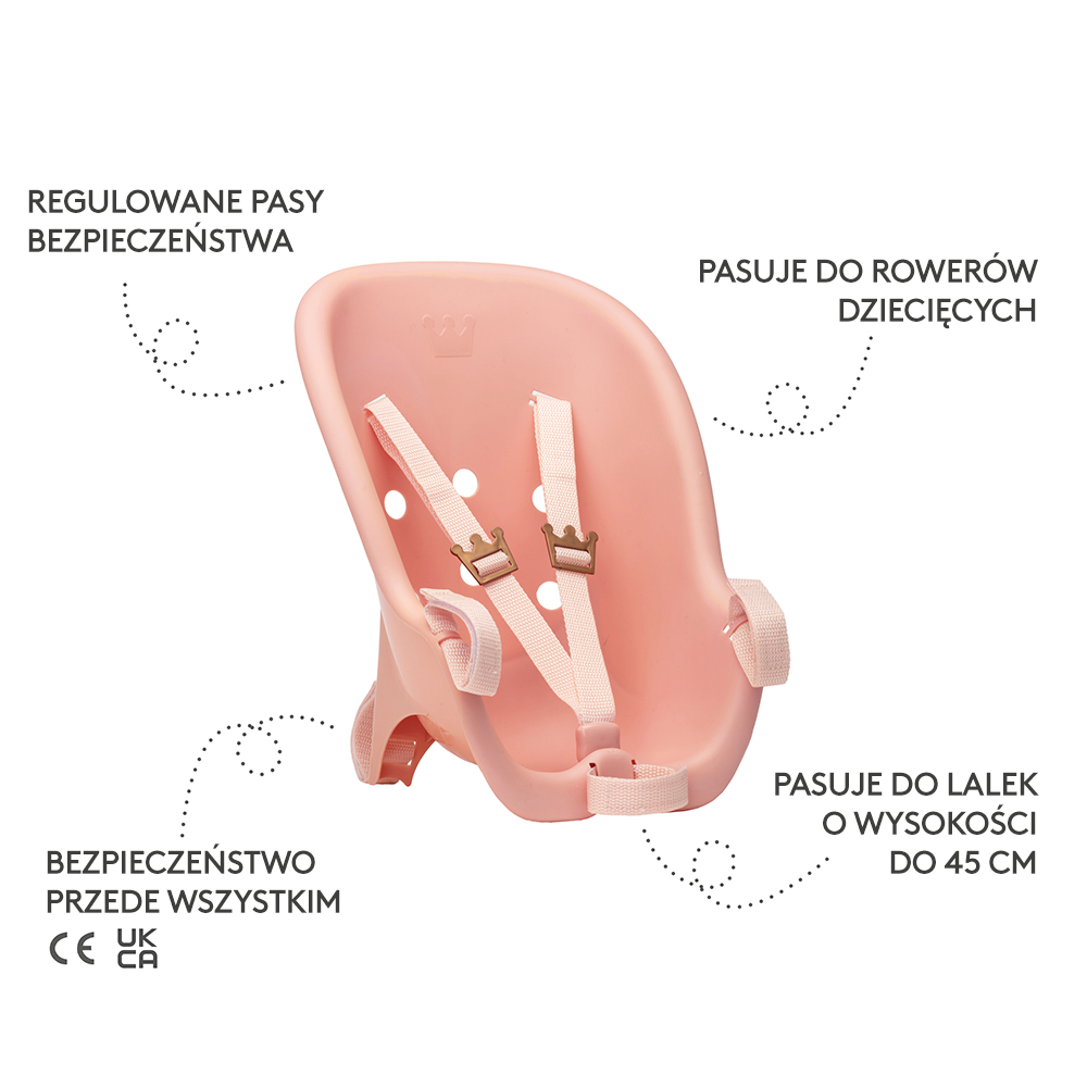 Twoja lalka musi mieć fotelik rowerowy, aby mogła bezpiecznie towarzyszyć Ci w wycieczce na dwóch kółkach! Ten fotelik rowerowy z łatwością zamontujesz zarówno z przodu, jak i z tyłu na swoim rowerze. Twoja lalka będzie zachwycona eleganckim i wygodnym fotelikiem, ozdobionym wygrawerowaną koroną godną małej księżniczki.