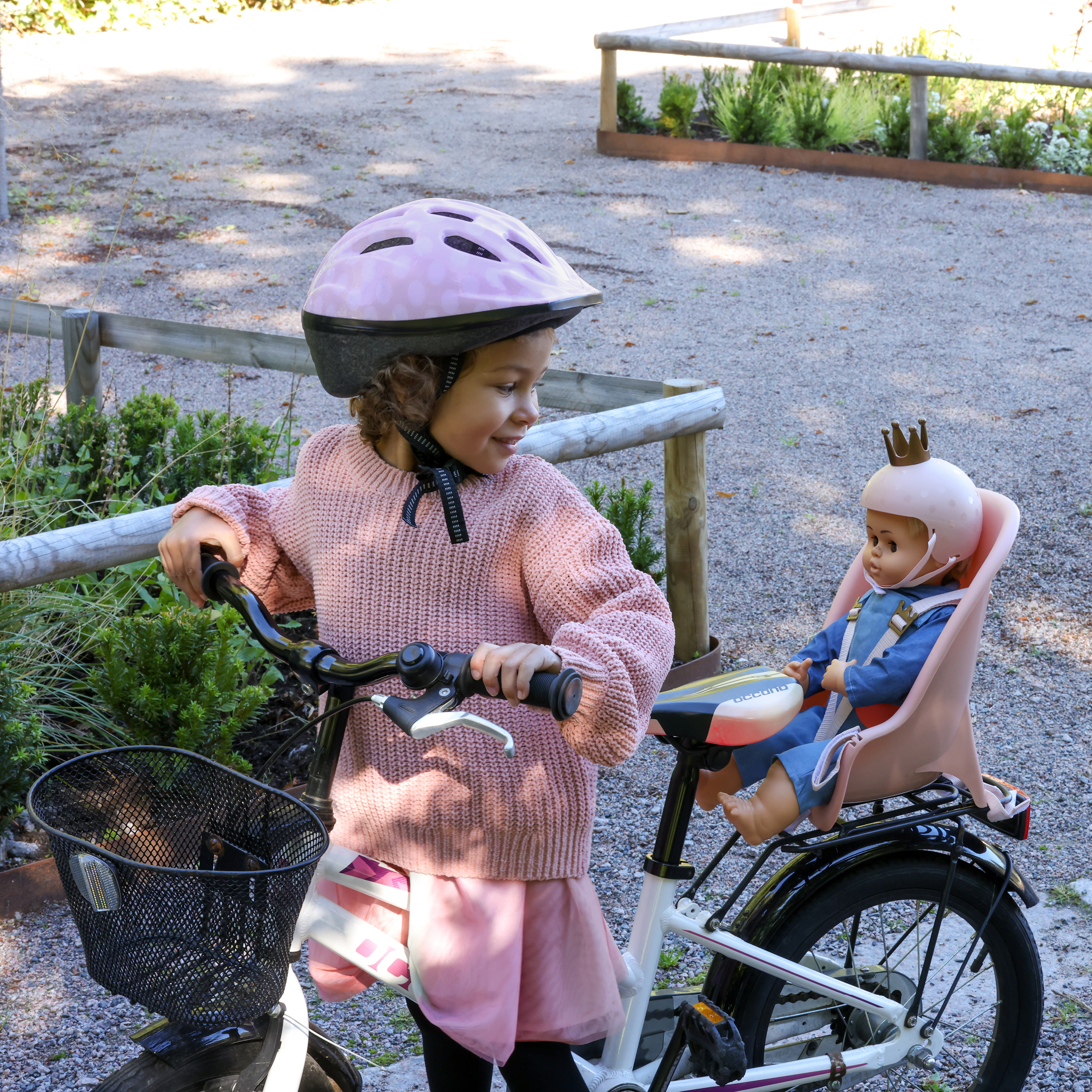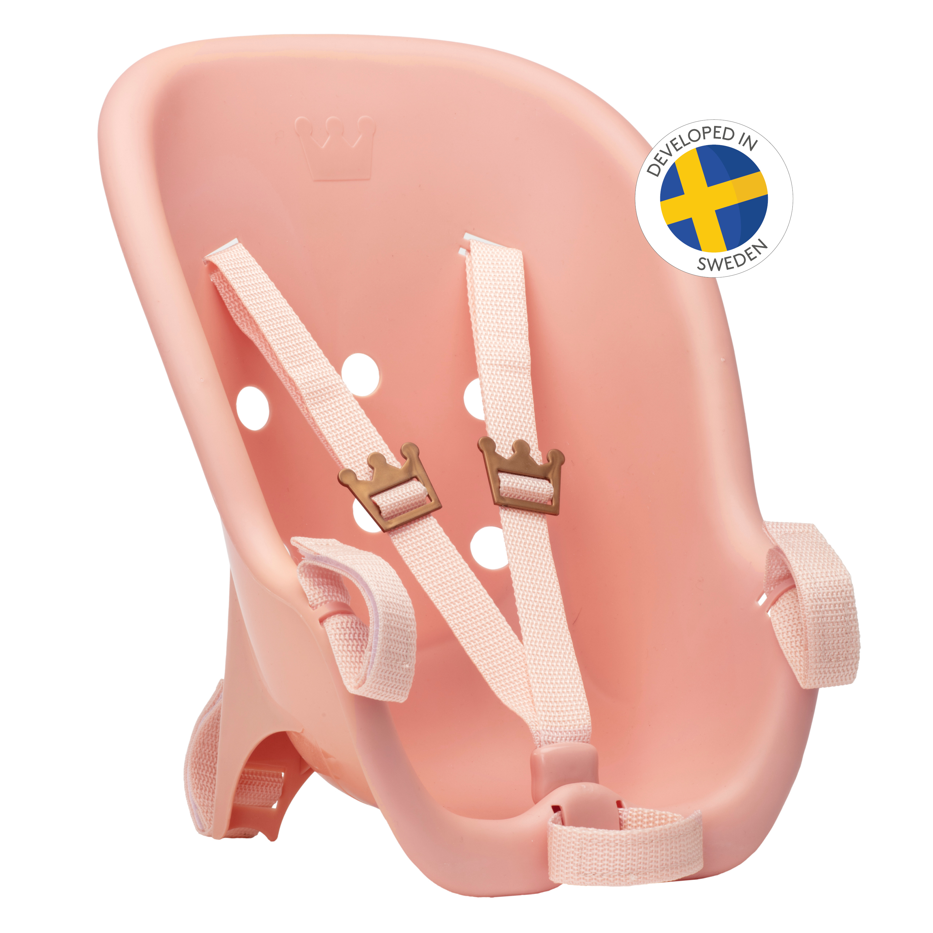 Wszyscy musimy dbać o bezpieczeństwo podczas jazdy rowerem. Oczywiście, również Twoja lalka musi mieć fotelik rowerowy, aby mogła towarzyszyć Ci w rowerowych eskapadach. Fotelik można przymocować zarówno z przodu, jak i z tyłu na rowerze dziecięcym. Szelki, które zabezpieczają lalkę w foteliku rowerowym z łatwością dostosujesz za pomocą klamer w kształcie złotych koron. Tył fotelika również zdobi elegancka wygrawerowana korona. Dopasuj fotelik z dostępnym osobno kaskiem rowerowym dla lalek Skrållan i ruszajcie na ekscytującą rowerową przygodę. Fotelik rowerowy pasuje do lalek o długości 35 - 45 cm. Opakowanie nie zawiera lalki.