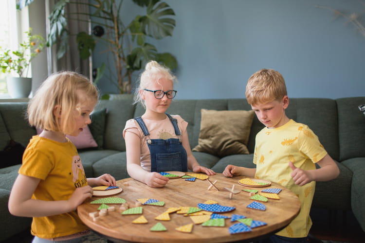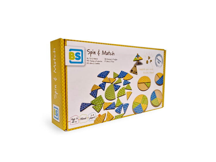 W zestawie znajdują się drewniane elementy: spiner koloru i spiner kształtu (5 x 6 x 6,5 cm), podstawki (14 cm) , tokeny kształtu i duże, różnokolorowe elementy na podstawkę.