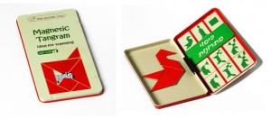 Cały zestaw zamknięty jest w sztywnym, metalowym pudełku. Wszystkie elementy gry to magnesy, dzięki czemu nie powypadają, a grać można w każdym miejscu. Tangram będzie więc idealny nie tylko w domu, ale i w podróży. Możemy też powrócić do rozpoczętej rozgrywki w każdym momencie.