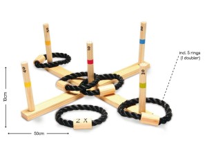 Wersja premium popularnej gry zręcznościowej polegającej na trafieniu obręczą na bolec. Drewniany krzyżak z kołkami oraz wykonane z grubego sznura obręcze gwarantują, że zabawka przetrwa niejeden sezon.