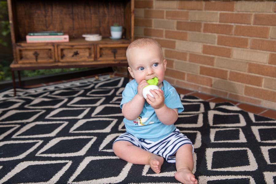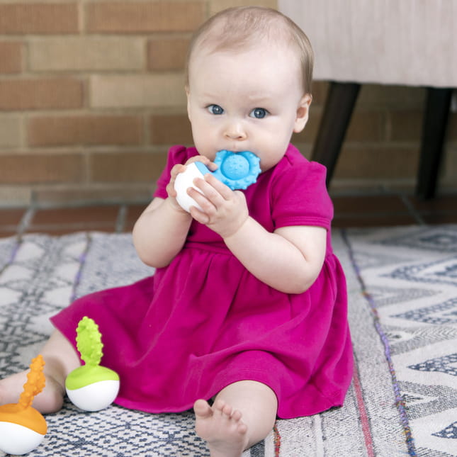 Gryzaki Dimpl dostępne są w trzech przyjemnych kolorach: niebieskim, zielonym i pomarańczowym - wybierz swój ulubiony i patrz, jak Twoje dziecko świetnie się nim bawi.