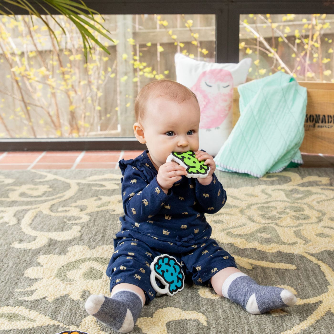 Gryzaczki w kształcie uśmiechniętych mózgów - logo Fat brain Toys dostępne są w trzech przyjemnych kolorach: niebieskim, zielonym i pomarańczowym - wybierz swój ulubiony i patrz, jak Twoje dziecko świetnie się nim bawi.
