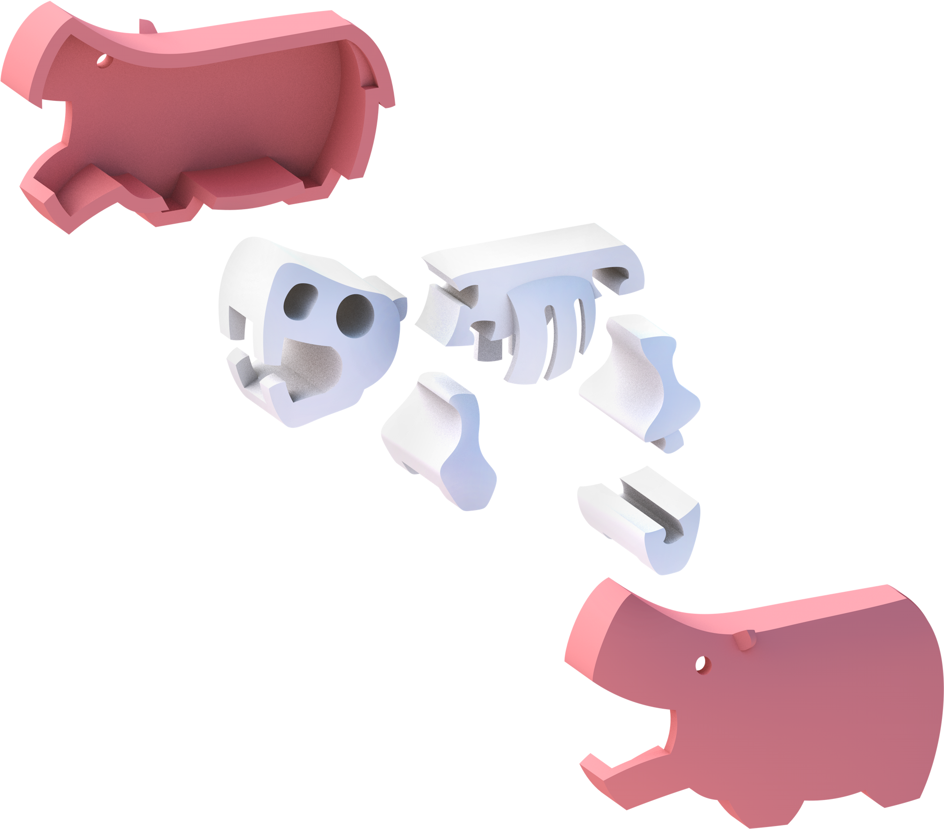Cała zabawka składa się z 7 elementów: 2 magnetycznych połówek hipopotama oraz 5 fragmentów szkieletu. Gotowego hipcia można ustawić na makiecie sawanny dołączonej do zestawu, zawiera ona tło, skałę i drzewo.