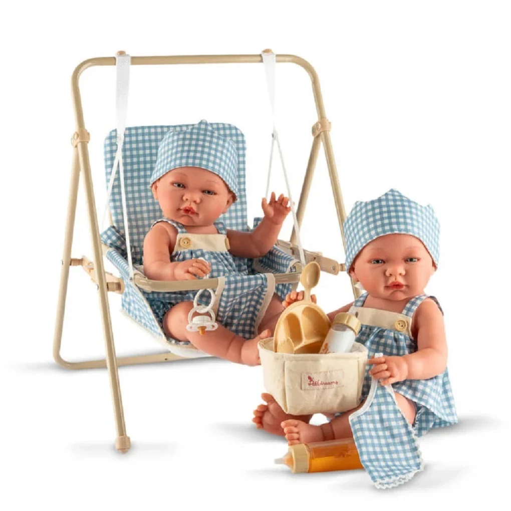 Piękna i funkcjonalna huśtawka cenionej hiszpańskiej marki ASI została zaprojektowana dla lalek o wysokości od 36 do 46cm. Wzbogaca ona popularną kolekcję akcesoriów Noel. Zachwyca ponadczasowy wzór w biało-niebieską kratkę. Huśtawka ta jest idealnym dodatkiem uzupełniającym pomysłową zabawę najmłodszych. Pozwala im tworzyć niezapomniane historie i spędzać wyjątkowe i niezapomniane chwile z ulubionymi towarzyszami zabaw: bobasami, lalkami klasycznymi lub maskotkami.