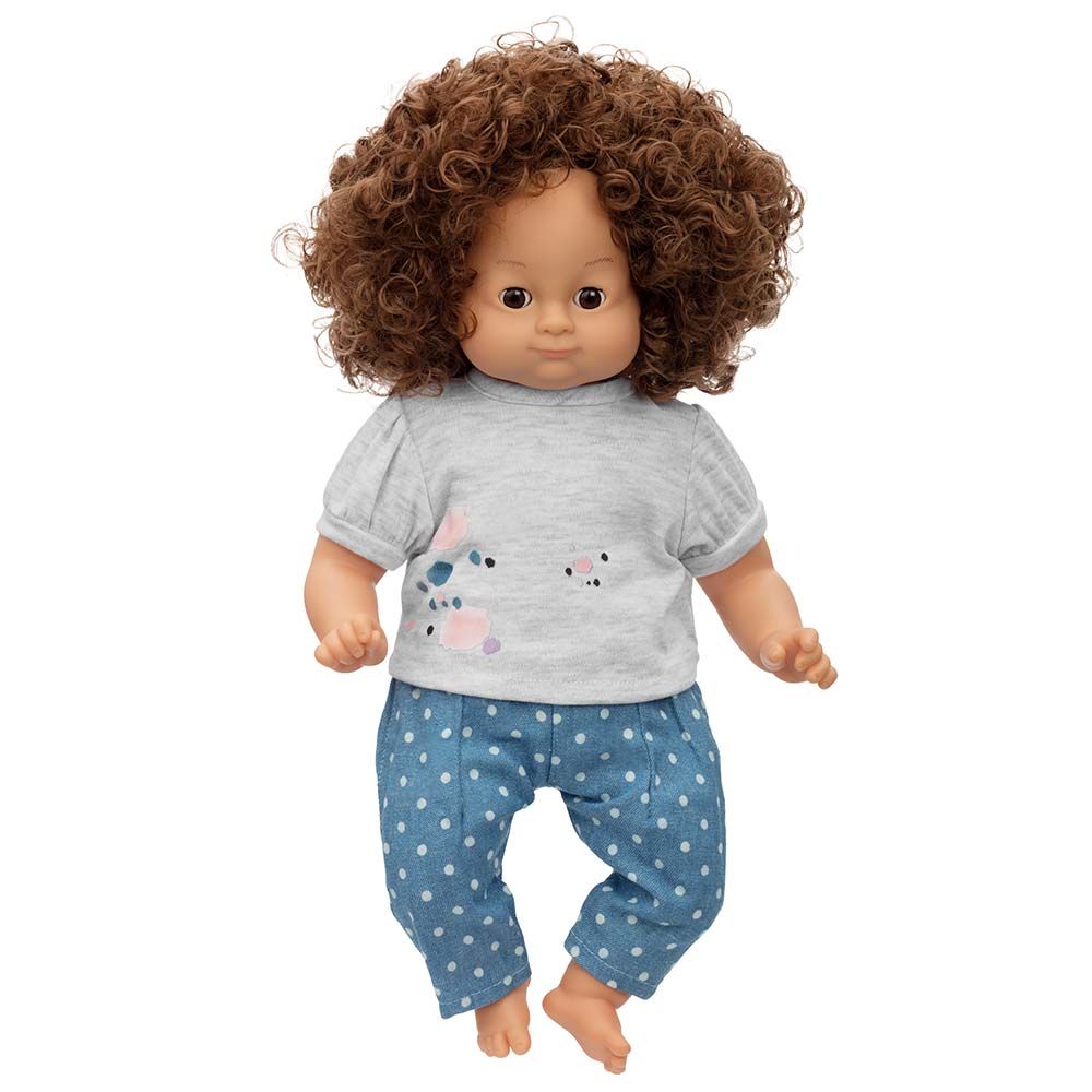 Dziś postaw na luz! Szary top z kolorowym nadrukiem i jeansy w kropeczki to sprawdzona stylizacja na wiele okazji. Spotkanie z przyjaciółmi, zabawa na dworze czy spacer? Ten zestaw sprawi, że Twoja lalka będzie wyglądać i czuć się fantastycznie.