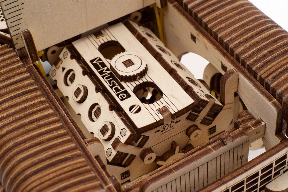 Podobnie do innych modeli mechanicznych silnik kabrioletu zasilany jest silnikiem gumowym i potrafi jeździć do przodu i do tyłu. Inżynierowie z Ugears zapewnili także możliwość podglądania pracy 8-cylindrowego silnika widlastego, dzięki zastosowaniu biegu jałowego auto nie ruszy z miejsca - wystarczy wtedy podnieść maskę i można ocenić działanie mechanizmu silnika. Wszystko działa jak trzeba? Przestaw dźwignię zmiany biegów i w drogę!