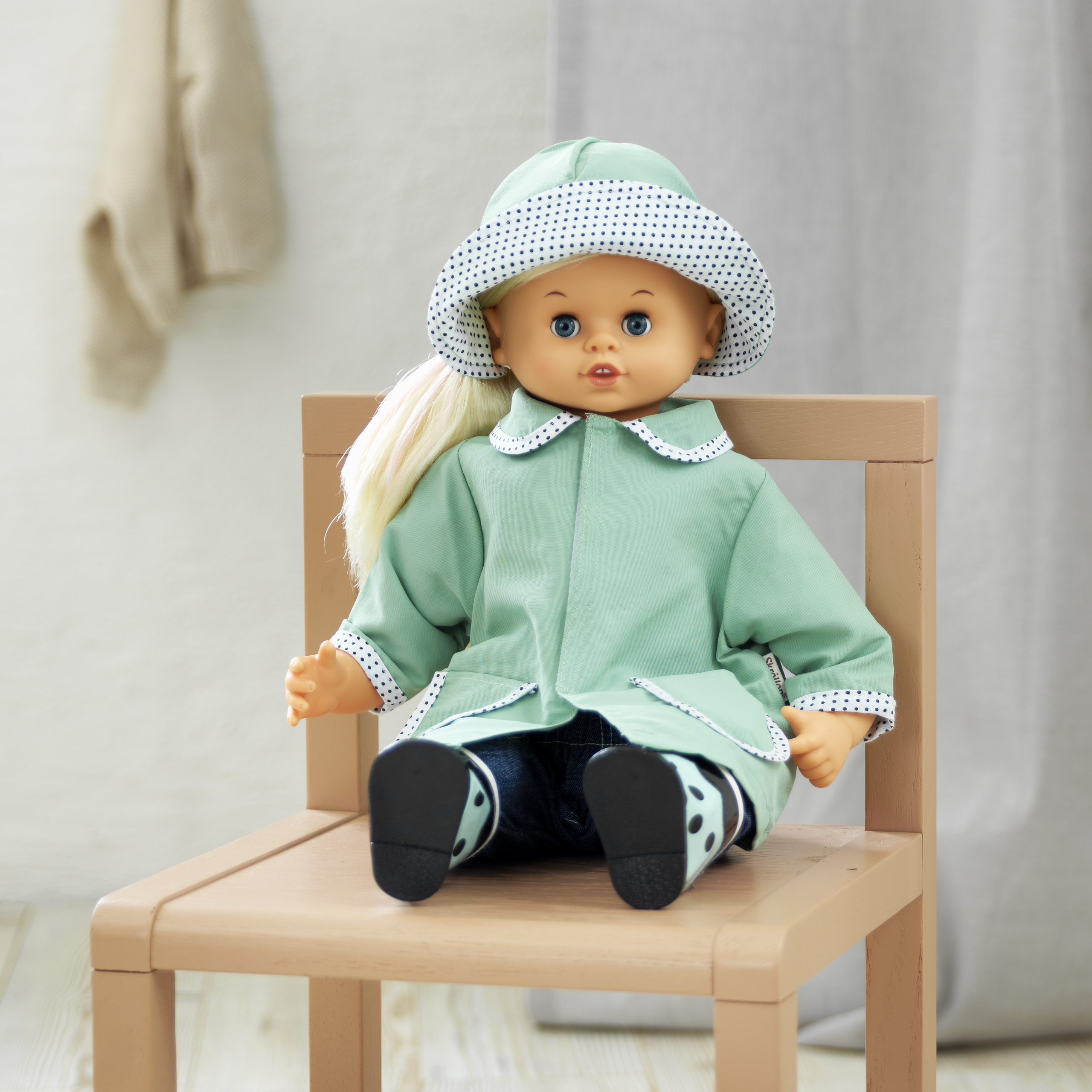 Wypróbuj pasujący zestaw przeciwdeszczowy - miętową kurtkę i kapelusz, sprzedawane osobno. Oryginalne szwedzkie wzornictwo i realistyczny wygląd skutecznie pobudzają wyobraźnię dziecka i wraz z szerokim wachlarzem dostępnych ubranek i akcesoriów pozwalają tworzyć nowe stylizacje i eksperymentować bez ograniczeń. Model odpowiedni dla lalek w rozmiarze 45 cm.