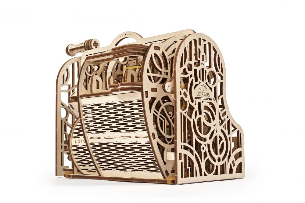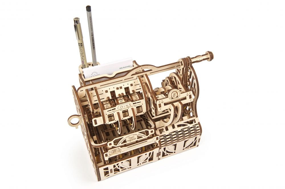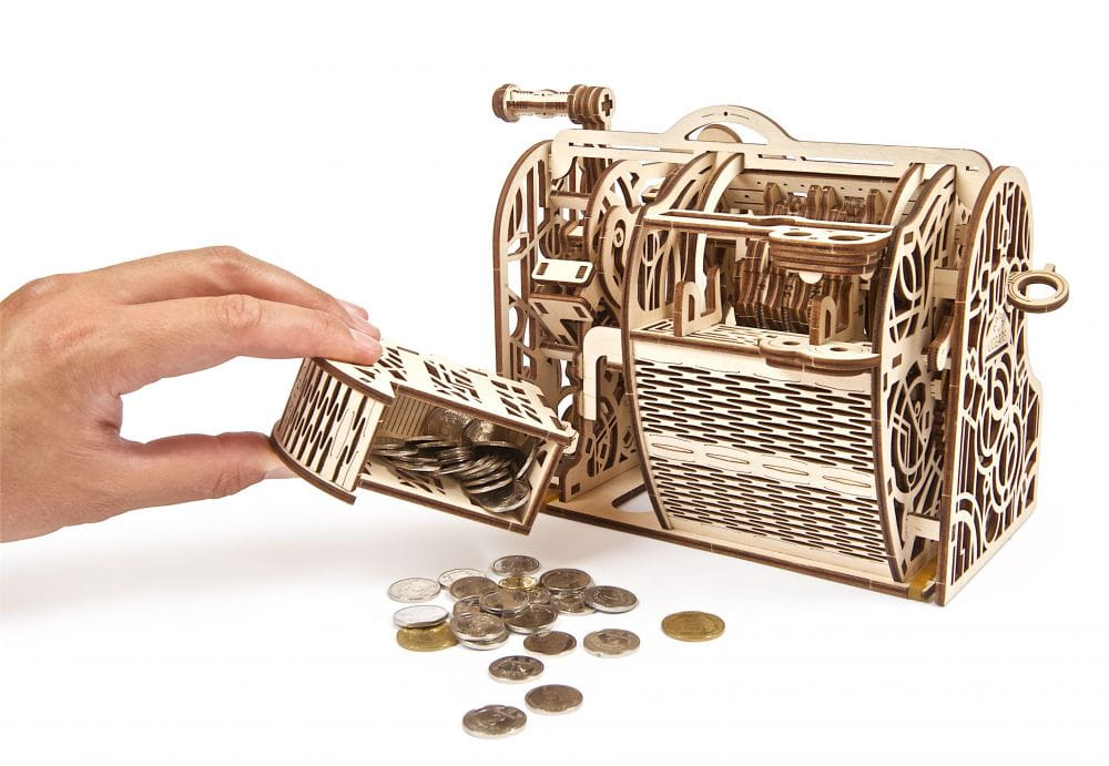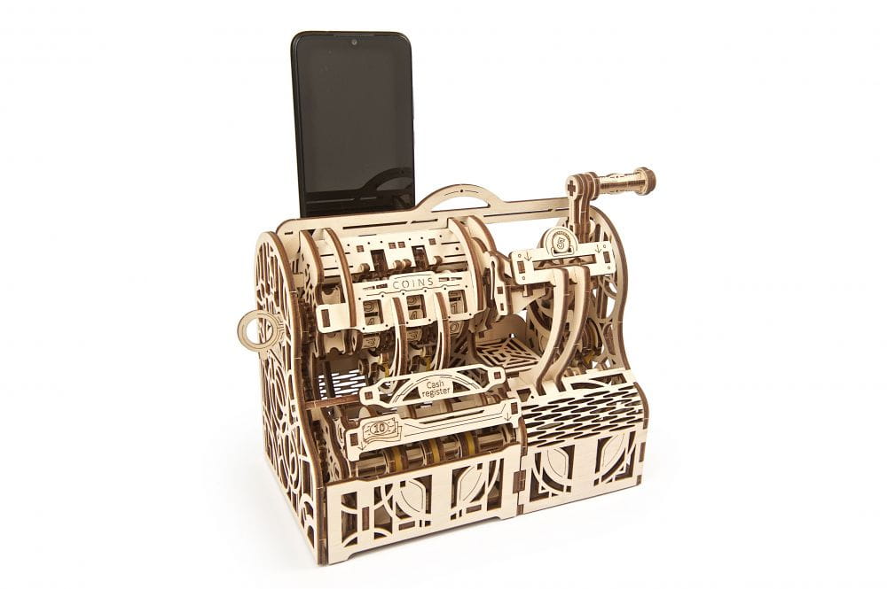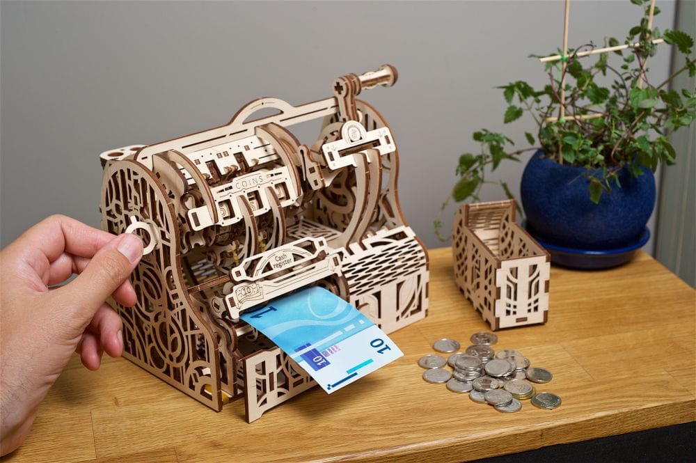 Kasa fiskalna Ugears w stylu retro jest jak najbardziej praktyczna. Twój bank pobiera zbyt wysokie prowizje za wpłaty i wypłaty? Zbuduj swoją własną kasę fiskalną i kontroluj gotówkę. Wpłacaj i wypłacaj, kiedy zechcesz, zarówno bilon jak i banknoty.