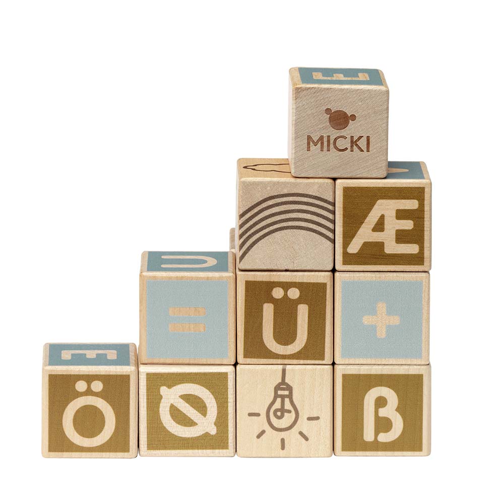Zestaw zawiera 36 kolorowych klocków w kształcie kostek do gry, których wszystkie ścianki przedstawiają litery, cyfry, znaki specjalne, piktogramy i ilustracje. Klasyczne drewniane klocki marki Micki pozwolą Twojemu dziecku poznać alfabet, tworzyć pierwsze słowa i wprowadzą je do nauki pisania i liczenia w formie niekończącej się zabawy. A do tego można z nich budować bez końca!