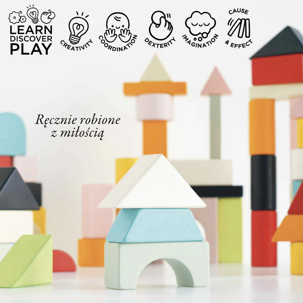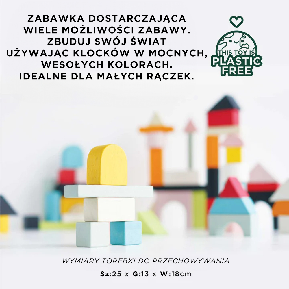 Drewniane klocki mają różne kształty doskonałe do budowania wymyślnych konstrukcji. Zestaw zawiera 60 sztuk klocków o gładkich krawędziach oraz materiałową torbę, dzięki czemu po skończonej zabawie można je wszystkie odłożyć na miejsce lub wygodnie transportować, by bawić się także poza domem.