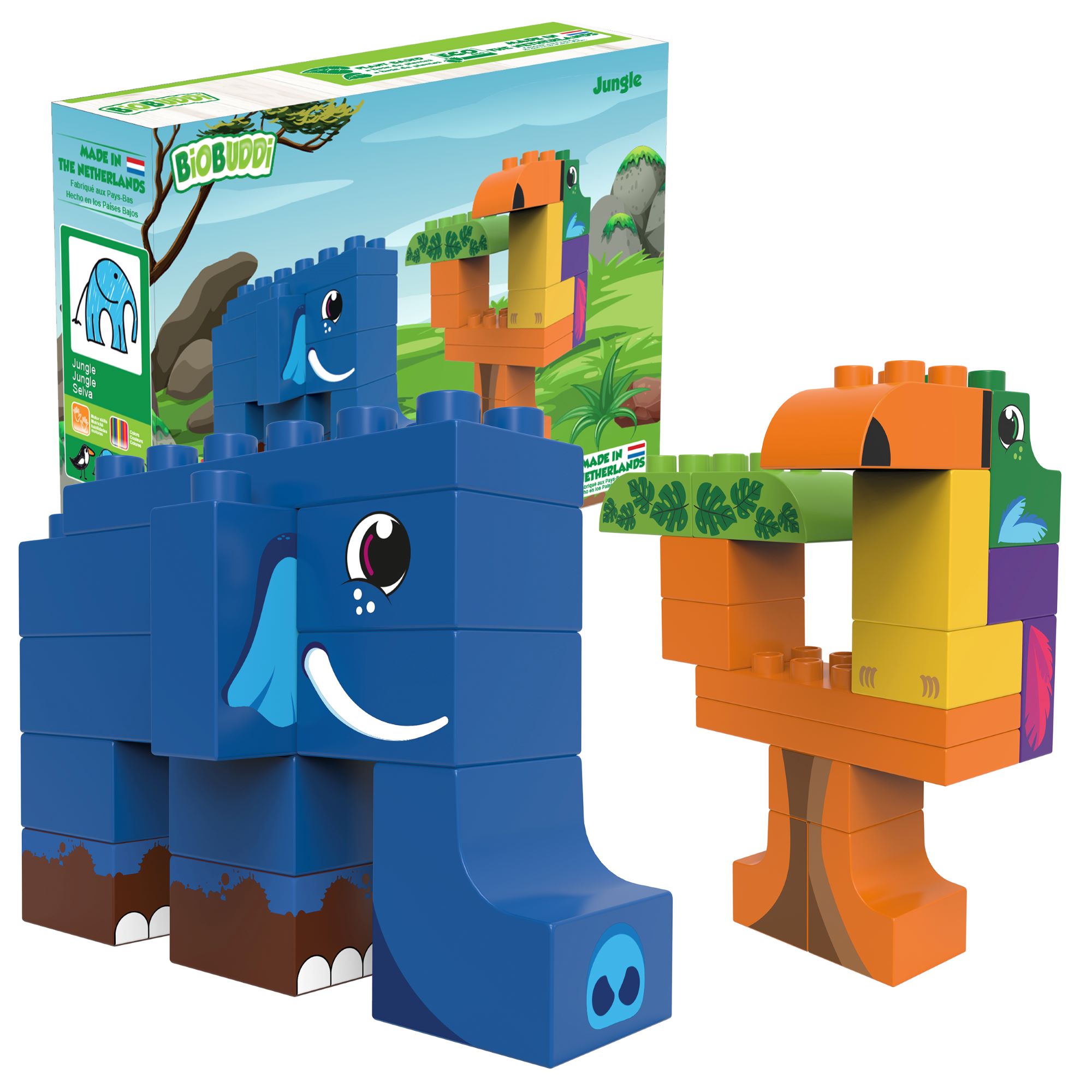 Ekologiczne klocki Biobuddi - zestaw 2w1 Słoń i tukan - klocki dla tych, którzy dając dziecku najlepsze zabawki, pamiętają także o środowisku.