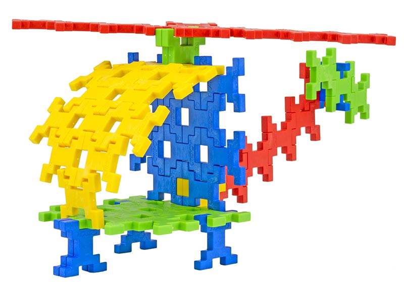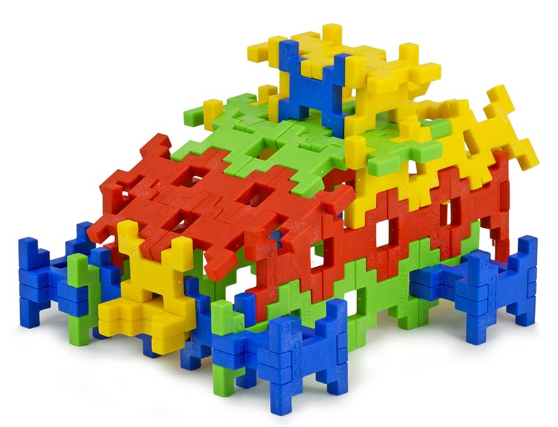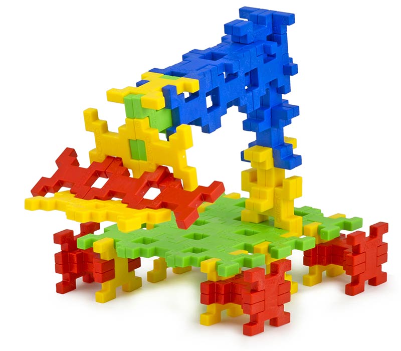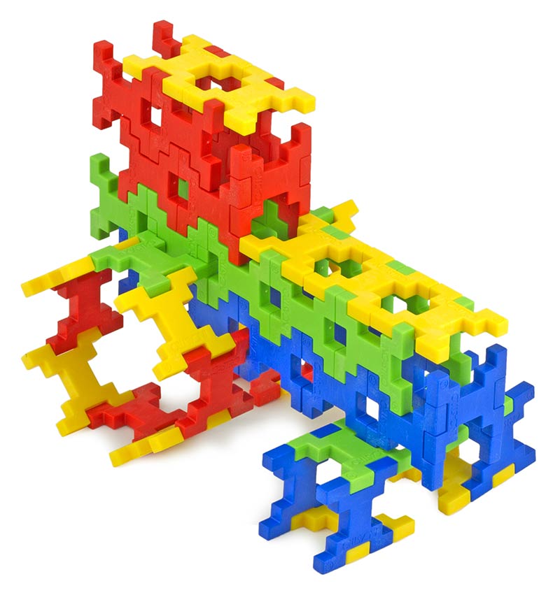 Wymiary pojedynczego elementu to 3,5 x 3,5 x 0,5 cm - zatem są wystarczająco duże, by nie wypadały z małych rączek, a po zbudowaniu konstrukcji może mieć ona okazałe rozmiary. Elementy wykonane są z przyjemnego w dotyku i wytrzymałego materiału, nie posiadają ostrych krawędzi, świetnie się ze sobą łączą i nie mają tendencji do rozczepiania, co gwarantuje trwałość budowli. Klocki w tym zestawie występują w 4 podstawowych kolorach, czystych i przyjemnych dla oka. Dzięki nietypowemu kształtowi klocki można łączyć naprawdę na wiele sposobów, tylko dwa elementy można sczepić ze sobą na 8 sposobów, gdy dysponujemy trzema - możliwości jest już 12, a dla 4 klocków to aż 16 różnych kombinacji!