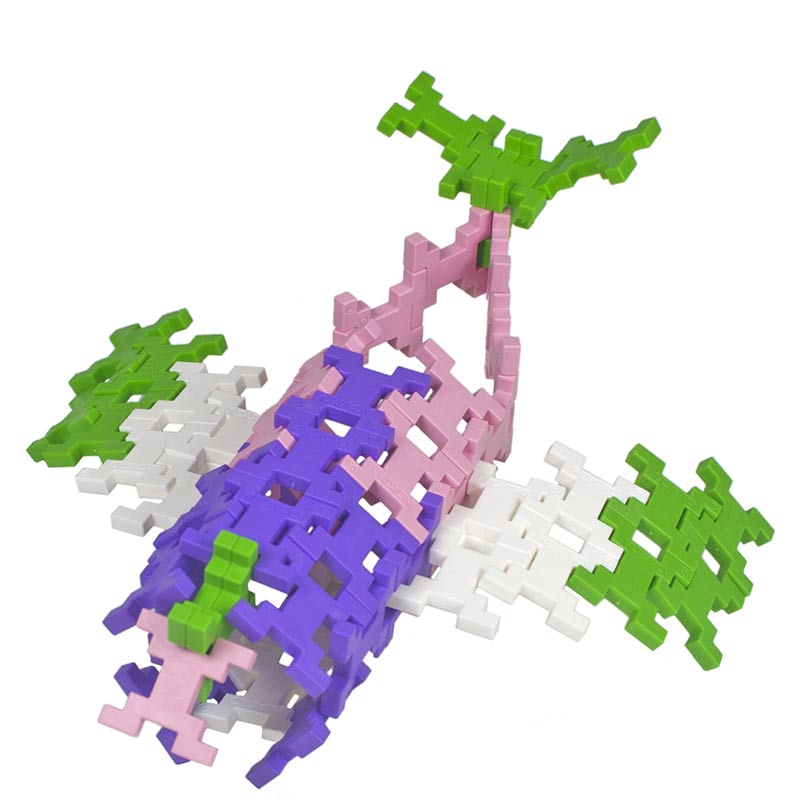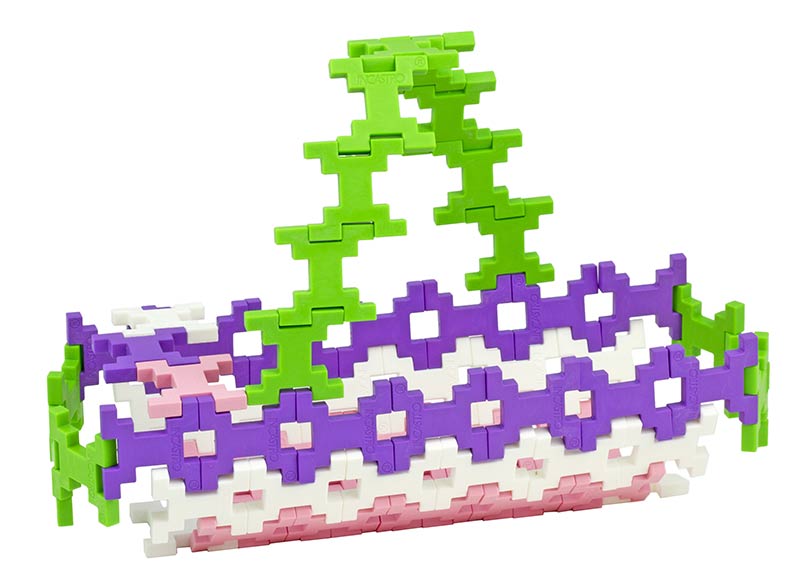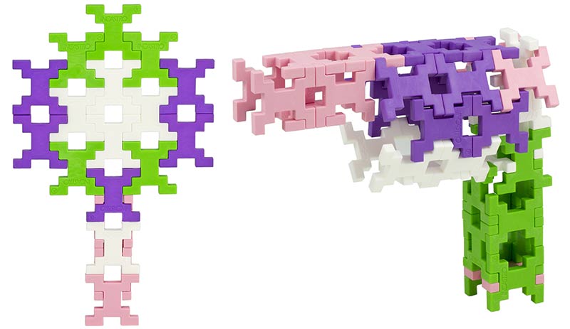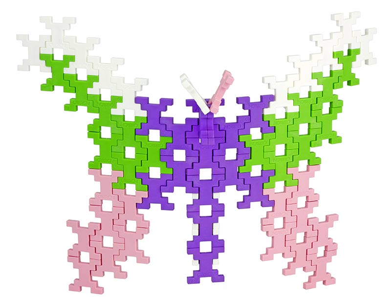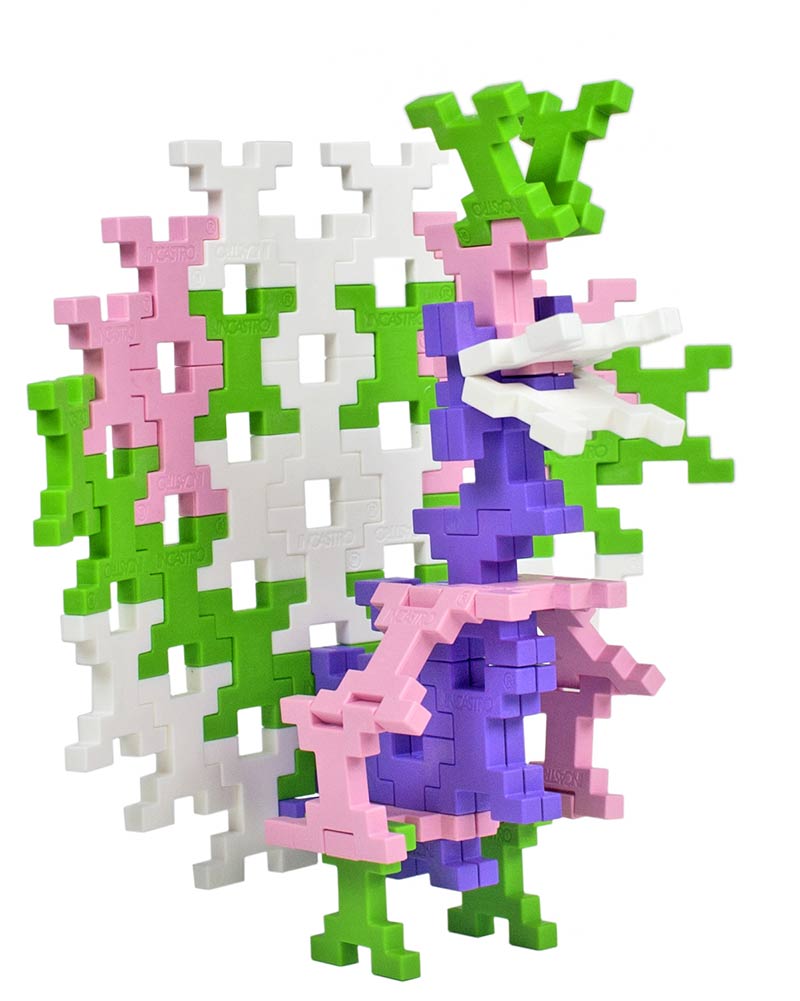 Wymiary pojedynczego elementu to 3,5 x 3,5 x 0,5 cm - zatem są wystarczająco duże, by nie wypadały z małych rączek, a po zbudowaniu konstrukcji może mieć ona okazałe rozmiary. Elementy wykonane są z przyjemnego w dotyku i wytrzymałego materiału, nie posiadają ostrych krawędzi, świetnie się ze sobą łączą i nie mają tendencji do rozczepiania, co gwarantuje trwałość budowli. Klocki w tym zestawie występują w 4 pastelowych kolorach (róż, fiolet, zieleń i biel), czystych i przyjemnych dla oka. Dzięki nietypowemu kształtowi klocki można łączyć naprawdę na wiele sposobów, tylko dwa elementy można sczepić ze sobą na 8 sposobów, gdy dysponujemy trzema - możliwości jest już 12, a dla 4 klocków to aż 16 różnych kombinacji!