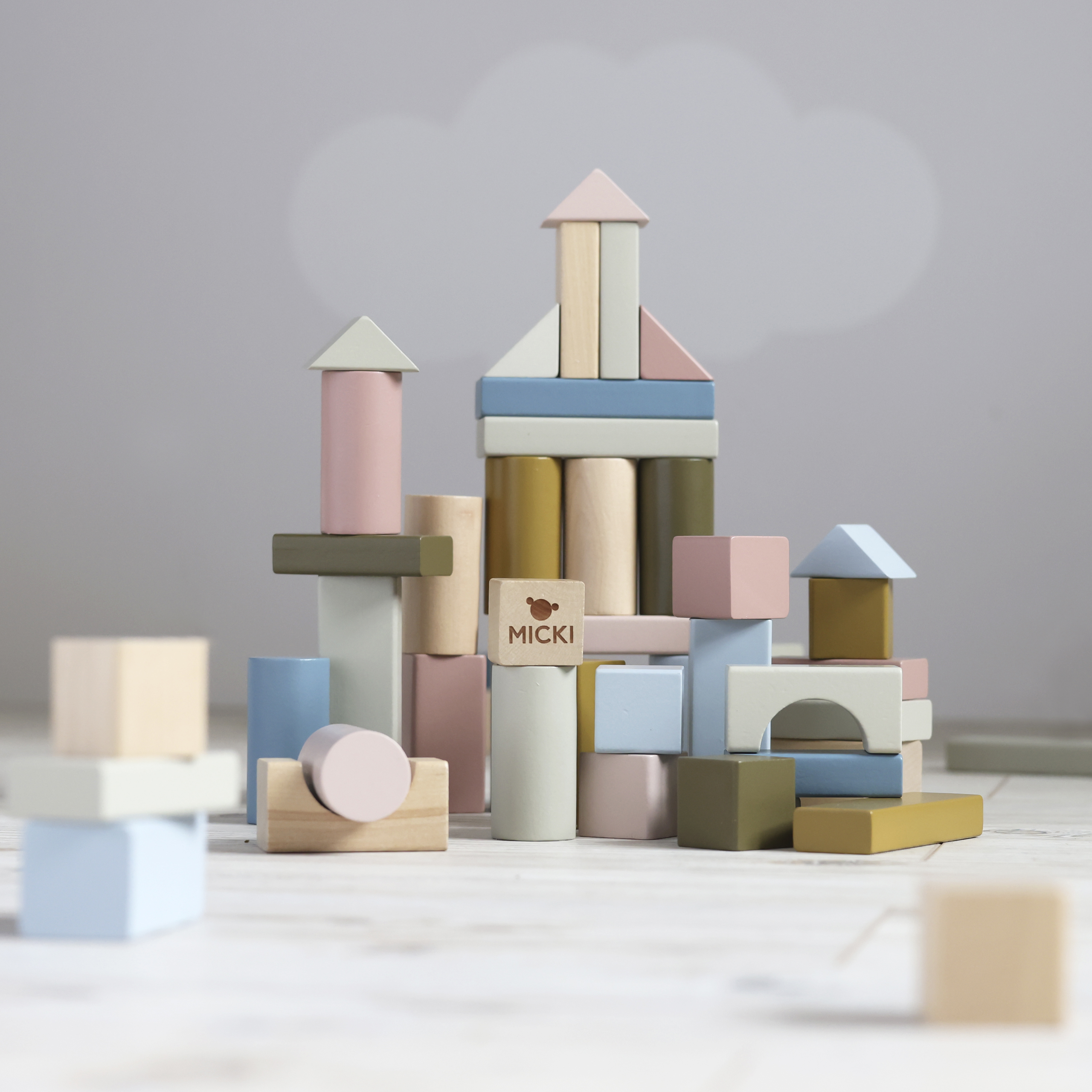 Ponadczasowe drewniane klocki mają pastelowe kolory i różne kształty, które pobudzają wyobraźnię dziecka, rozwijają jego koordynację ruchową i uczą ich rozpoznawania. Wspomagają rozwój kreatywności, zdolności poznawczych i manualnych nawet najmłodszych dzieci.