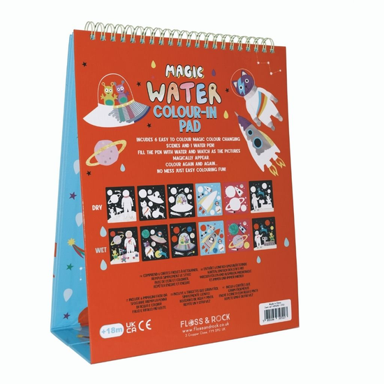 Kolorowanka wodna z pisakiem i podpórką to świetna zabawa dla najmłodszych. Wystarczy napełnić pisak wodą i zachęcić dziecko do kreatywnej zabawy, aby zobaczyć, jak kolory i kształty magicznie się pojawiają, a po wyschnięciu znikają. Dziecko będzie się świetnie bawić, odkrywając kosmitów, planety, spadające gwiazdy i wiele więcej. Sześć zabawnych kart jest połączonych w spiralnie oprawionej okładce, dzięki czemu można je odwracać po ukończeniu. Podpórka wygodnie podtrzymuje karty wielokrotnego użytku. Po zakończeniu zabawy wystarczy złożyć podpórkę, a dzięki elastycznej gumce pisak zawsze będzie na swoim miejscu.
