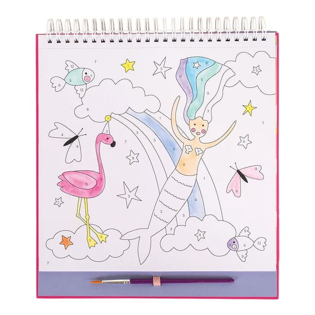 Zestaw zawiera 10 wyjątkowych kart z obrazkami do pomalowania w spiralnej oprawie. Każda karta ma perforowaną krawędź, dzięki czemu bardzo łatwo ją wyrwać i oprawić w ramkę lub powiesić. Do każdej karty dedykowana jest indywidualna paleta kolorowych farbek. Po zakończeniu zabawy wystarczy zamknąć okładkę, a dzięki elastycznej gumce pędzelek zawsze będzie na swoim miejscu.