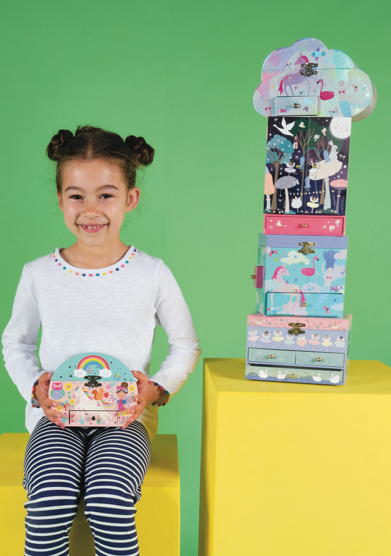 Pięknie zaprojektowana muzyczna szkatułka marki Floss & Rock to doskonałe miejsce do przechowywania dziecięcej biżuterii, gumek do włosów, spinek i innych cennych drobiazgów. Ozdobiona wspaniałymi ilustracjami jednorożców, flamingów, motyli i syren z holograficznymi, lśniącymi włosami i nie tylko. Nakręć kluczyk, a po otwarciu szkatułki zobaczysz magicznego jednorożca wirującego przed lustrem, podczas gdy pozytywka gra delikatną i przyjemną melodię. Szkatułka posiada poręczne wnętrze oraz małą szufladkę, a całość wykonana jest z wielką dbałością o szczegóły. Zapakowana w ozdobne pudełko, idealnie sprawdzi się jako prezent dla dziewczynek.