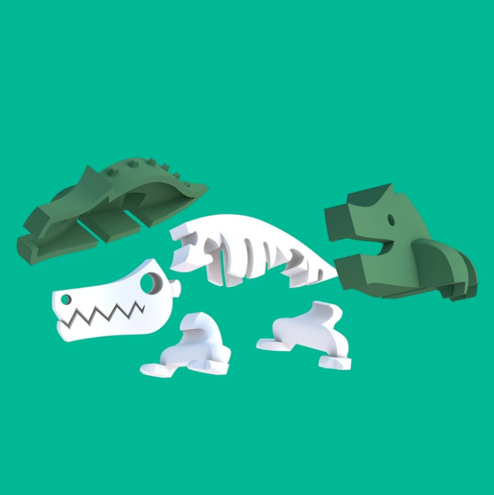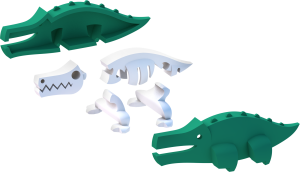 Cała zabawka składa się z 6 elementów: 2 magnetycznych połówek krokodyla oraz 4 fragmentów szkieletu. Gotowego krokodyla można ustawić na makiecie sawanny dołączonej do zestawu, zawiera ona tło, skałę i drzewo.