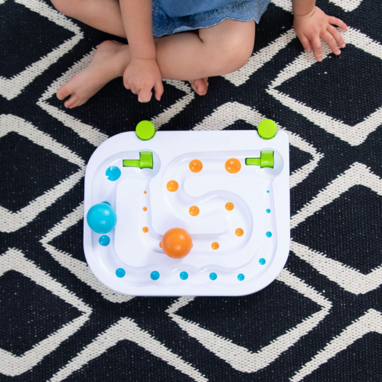 Użyj odpowiedniej siły, aby uruchomić wyrzutnię na początku trasy, a potem obserwuj, jak dzięki stopniowemu rozszerzaniu toru kuleczki nigdy nie zatrzymają się w połowie drogi. Zabawa labiryntem rozwija u dziecka zdolności motoryczne, a także uczenie się przyczynowo - skutkowe.