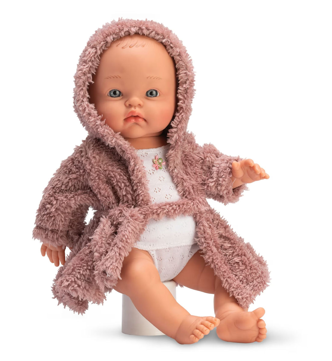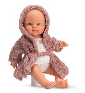 Wykonany z gładkiego, bezpiecznego winylu bobas o imieniu Alex zachwyca oryginalnie zaprojektowanym, pomysłowym strojem. Miękki, ciepły szlafroczek niewątpliwie przyda się po kąpieli. Dzianinowy komplet w kolorze białym: koszulka ozdobiona kwiatuszkową aplikacją i majteczki idealnie dopełniają outfit. Wszystkie ubranka można zdjąć, a lalę przebrać. Lalka hiszpańska znanej marki ASI ma 36 cm wysokości. Polecamy ją dzieciom w wieku od 3 lat.