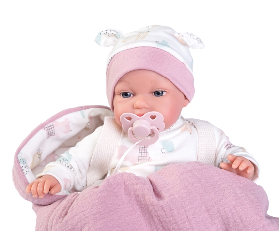 Lalka zapakowana jest w różowe, firmowe pudełko, które wygląda wyjątkowo. Tak zaprojektowany i ozdobiony karton nie wymaga żadnego dodatkowego opakowania. Elegancki kartonik można wykorzystać również jako łóżeczko do spania dla lali. Bobas Toneta marki Antonio Juan jest przeznaczony dla dzieci od 3 roku życia.