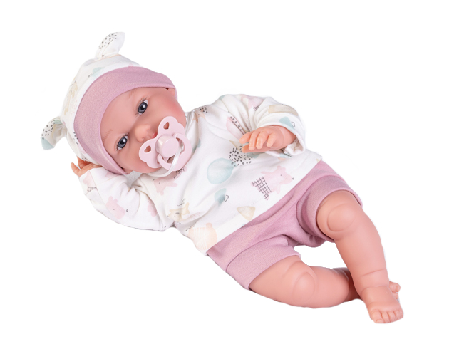 Lalka jest ubrana w bluzkę na długi rękaw oraz krótkie spodenki na gumce. Bluzka ma leśny motyw z zapięciem z tyłu na rzep. Komplet uzupełnia wsuwana czapka z uszami pasująca do całego kompletu. Cudownie ubrana i zaprojektowana lalka z pewnością może służyć do odgrywania roli dziecka. Wszystkie elementy kompletu można zdjąć, dzięki czemu nasza pociecha nabiera wprawy w przebieraniu i uczy się codziennych czynności, które będą towarzyszyć w przyszłym życiu.