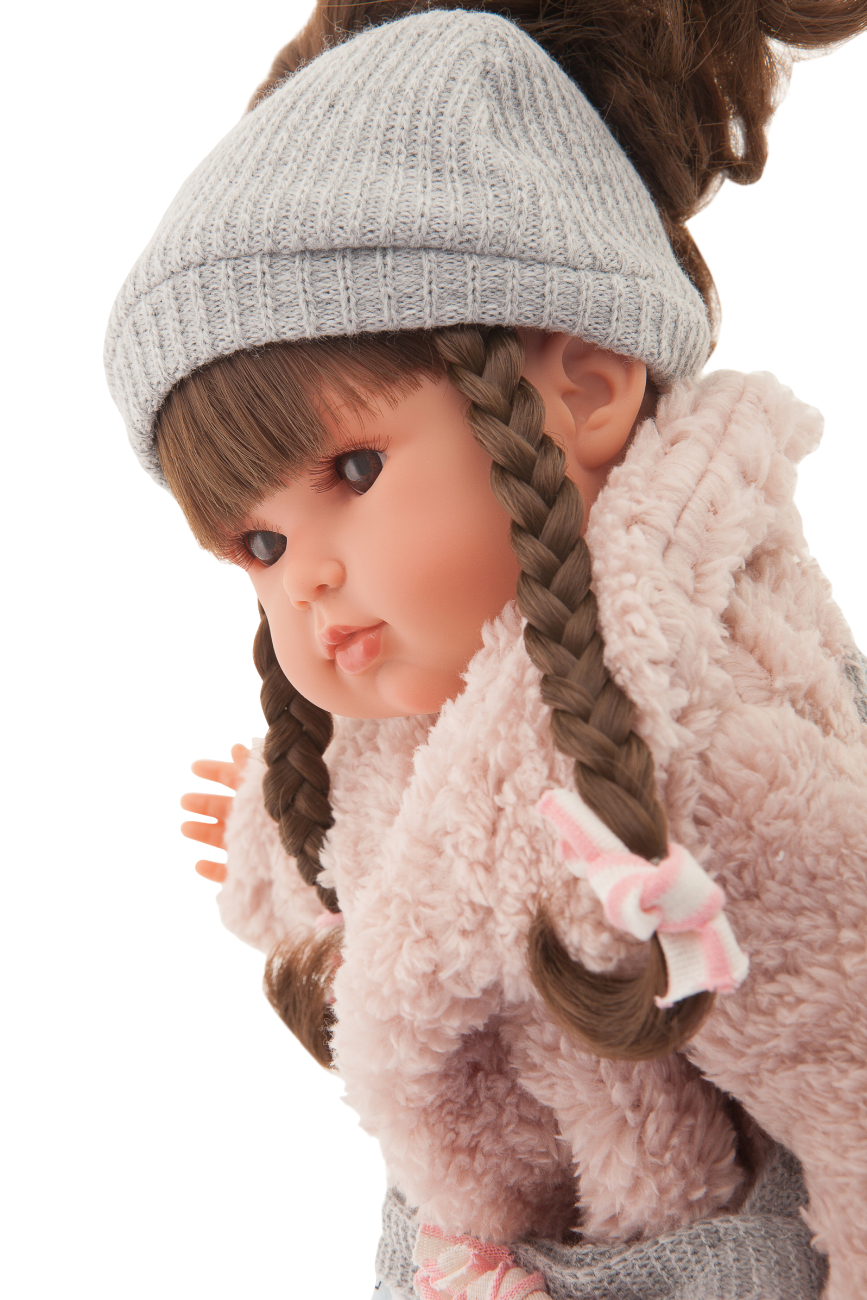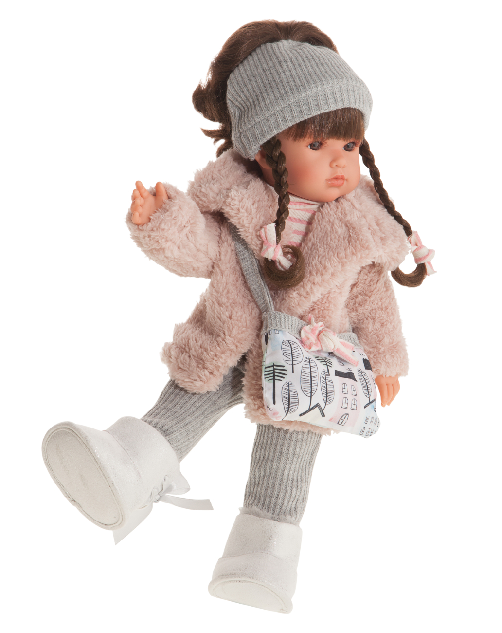 Filigranowa dziewczynka 28120 uzupełnia kolekcję lalek hiszpańskich marki Antonio Juan. Lalka o imieniu Bella ma 45 cm wysokości i po odpowiednim ułożeniu nóżek stoi samodzielnie. Lalka przypomina nieco starszą dziewczynkę z długimi włosami przeznaczoną do czesania. Bella ma śliczne, gęste brązowe włoski z dwoma warkoczykami,które ozdobiono białymi gumeczkami w różowe paseczki. Warkocze można rozpuścić i rozczesać. Najmłodsze pociechy mogą zadbać o stylizację włosów lub upiąć je w nową fryzurę,aby nadać zupełnie inny wygląd swojej ulubionej lali. Dodatkową fryzurę zdobi ciepła, prążkowana czapeczka. Dodatek na głowę za pewne przyda się podczas spacerów w chłodniejsze dnia co by urocza Bella nie zmarzła.