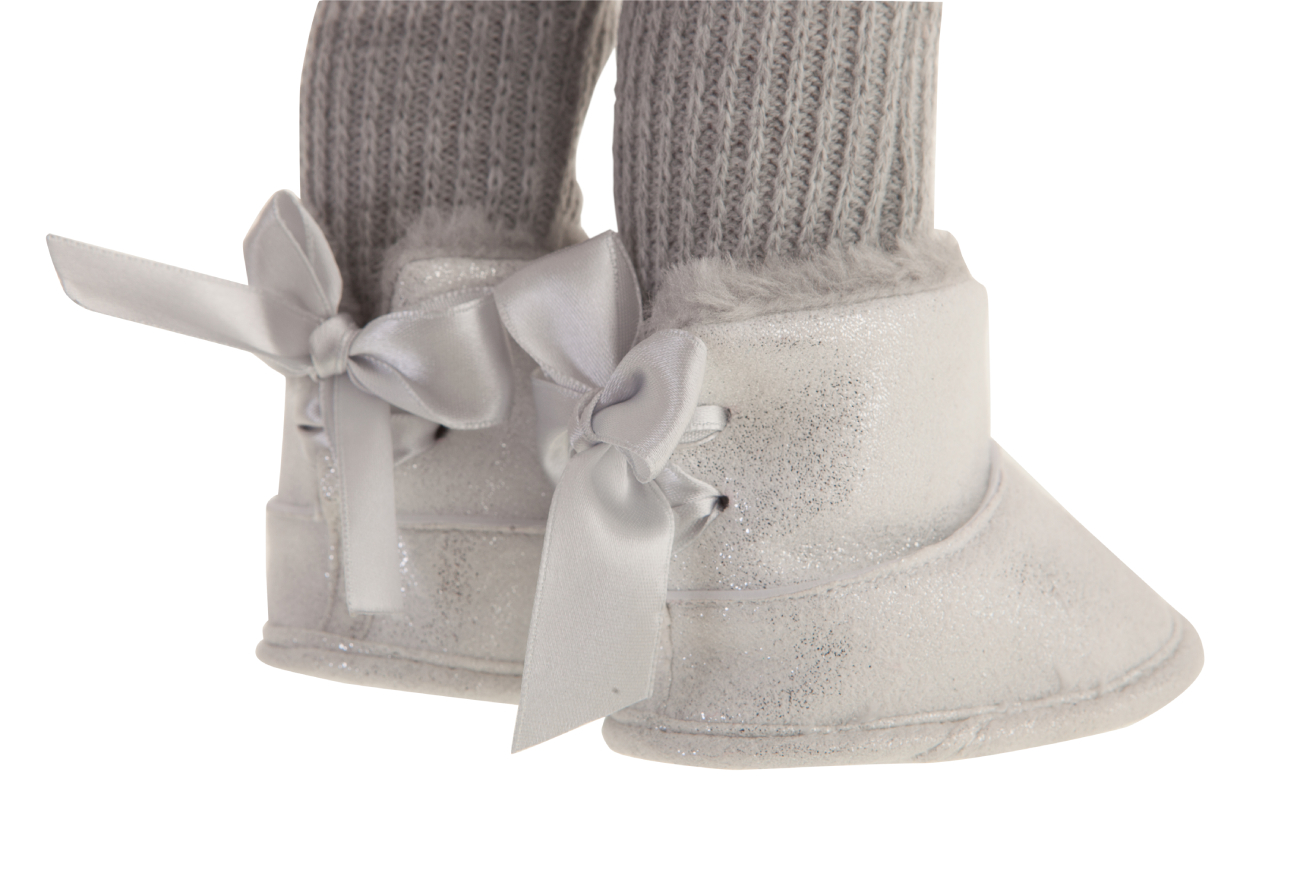 Bella ubrana jest w przepiękną zimową stylizację, którą niejedna dziewczynka chciałaby mieć w swojej szafie. Lalka ma na sobie sweterek w paski na długi rękaw oraz szare rajstopki wykonane z dzianiny. Dopełnieniem stroju będą również szare błyszczące buciki w środku wysłane przyjemnym futerkiem. Obuwie przypomina typowe śniegowce ozdobione z tyłu atłasową kokardką. W garderobie uroczej fashionistki nie mogło zabraknąć białej torebki z motywem w listki. Ciepłe ubranka i dobrane kolory idealnie podkreślają urodę brunetki. Dodatkowo ubiór wyposażono w ciepły, futrzany płaszcz wyśmienicie komponujący się z resztą stroju. Wszystkie ubranka można zdjąć, dzięki czemu nasza pociecha nabiera wprawy w przebieraniu lali i zmianie jej stroju,co w życiu codziennym pozwoli na szybsze samodzielne się ubranie.